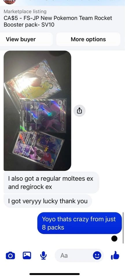 Sealed JP Team Rocket booster packs from Japan Pokemon Center and convenience stores. $5/pack, please feel free to let me know how many packs you need. Few people have had good pulls already, time to get yours! Can mainly meet at IKEA Coquitlam area and Aberdeen skytrain station area.