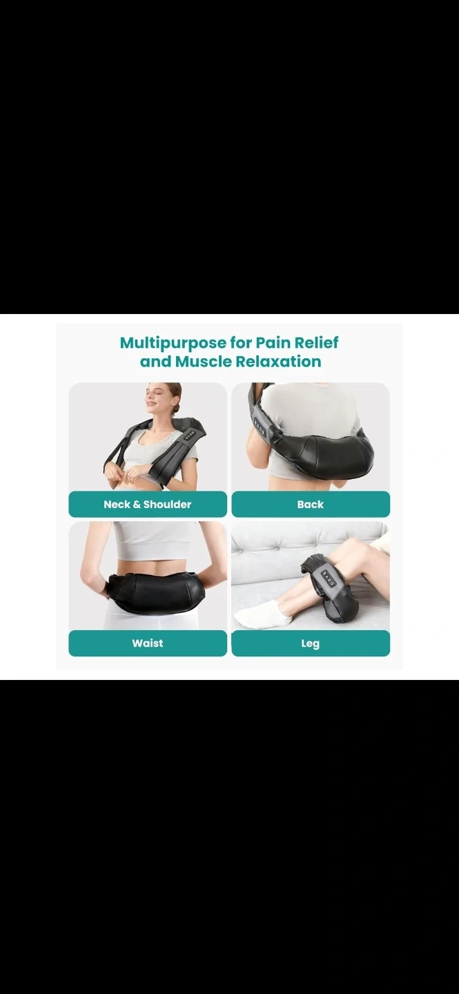 This is a Nekteck shiatsu neck massager. It offers deep tissue, 3D kneading massage for pain relief. It's suitable for neck, shoulder, back, waist, and leg muscle relaxation. The massager features heat and can be used in a car or at home.