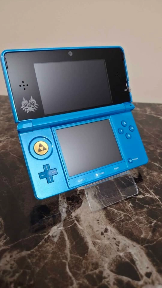 This console has had a brand new durable metal c-pad joystick installed (Triforce engraving, Gold). It also had the standard black plastic top screen lens replaced with a glass one (Majoras Mask laser etched) so the top screen is 100% free of wear and tear.