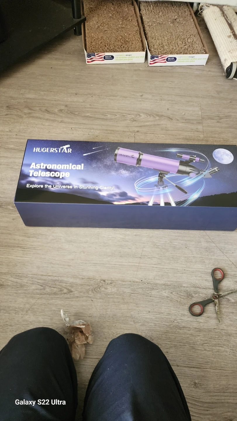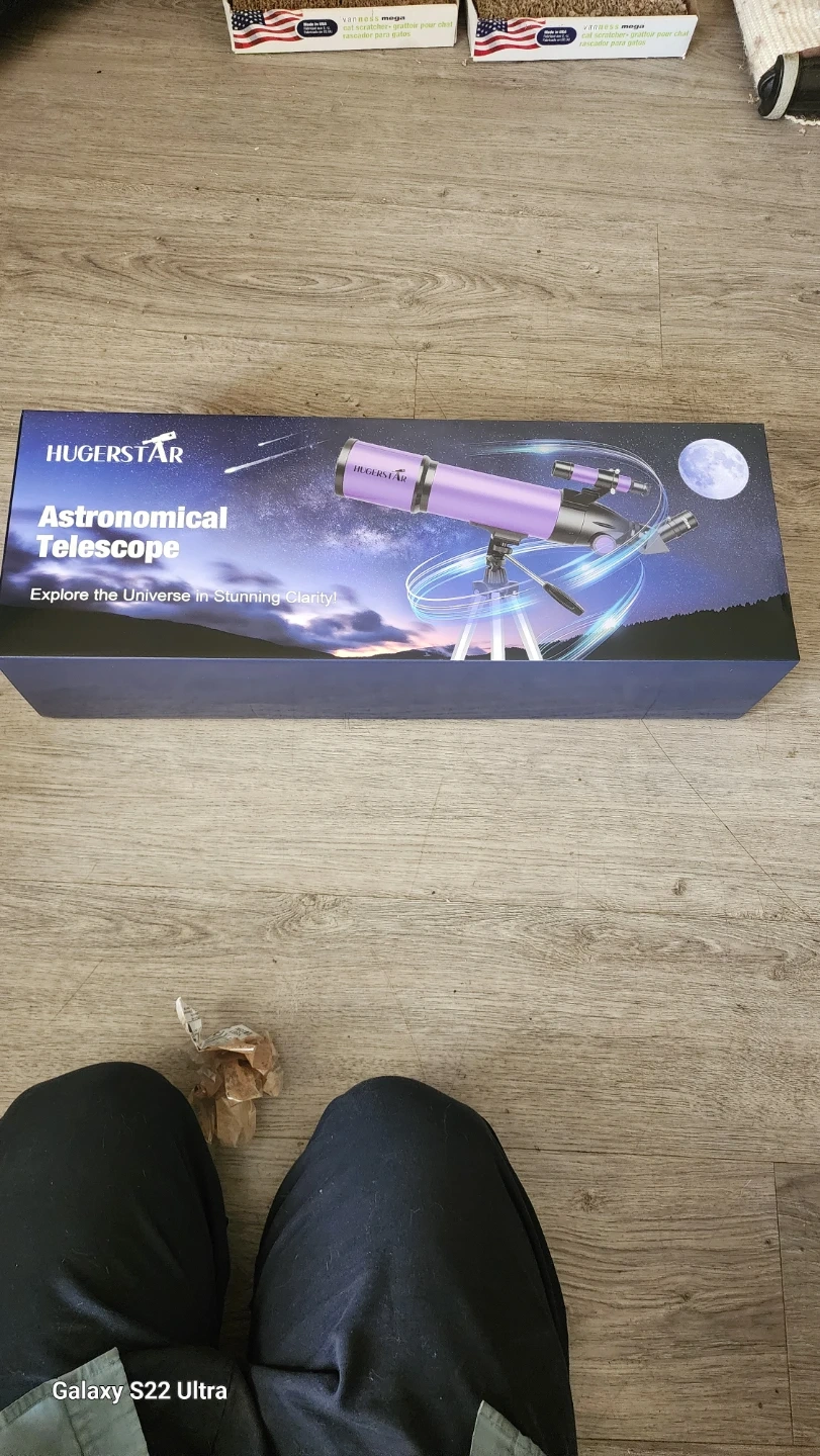 This HugerStar astronomical telescope comes with a carrying bag and all its original accessories. It's purple and includes a tripod for stable viewing. A great starter telescope for exploring the night sky!