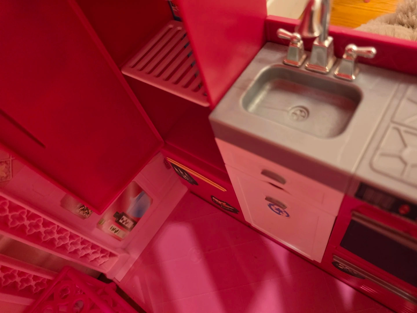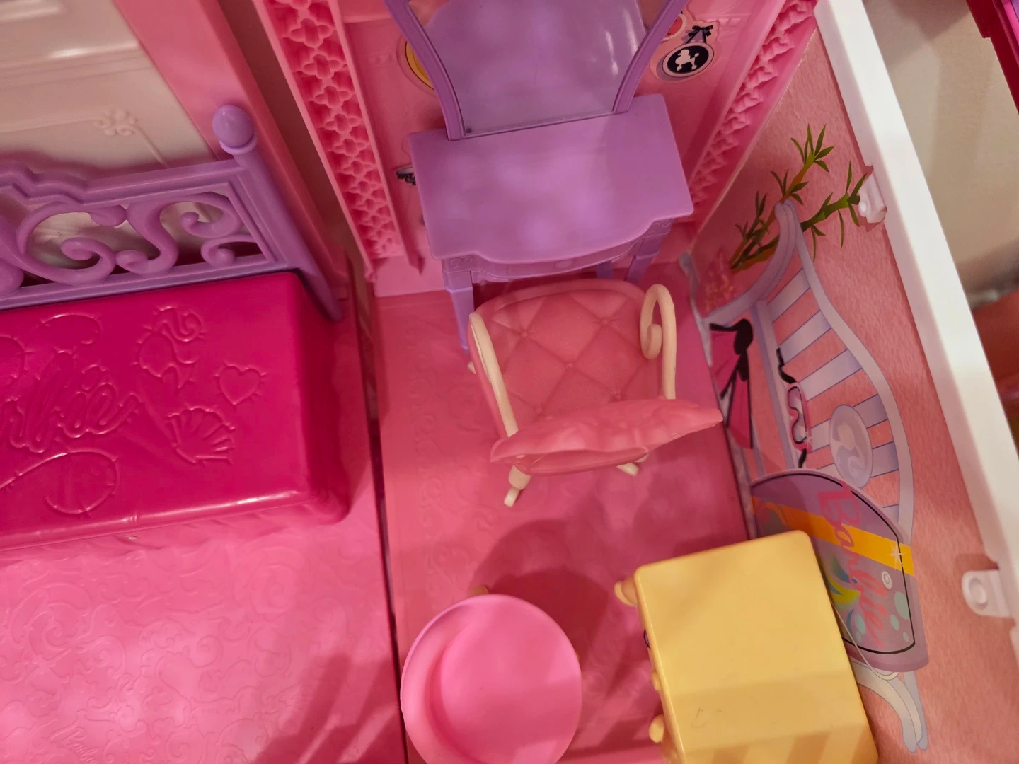 This is a Barbie Dreamhouse dollhouse with multiple levels and rooms. It includes furniture like a bed, chairs, and a kitchen set. The dollhouse is made of plastic and is primarily pink and white. It's a fun playset for imaginative adventures!