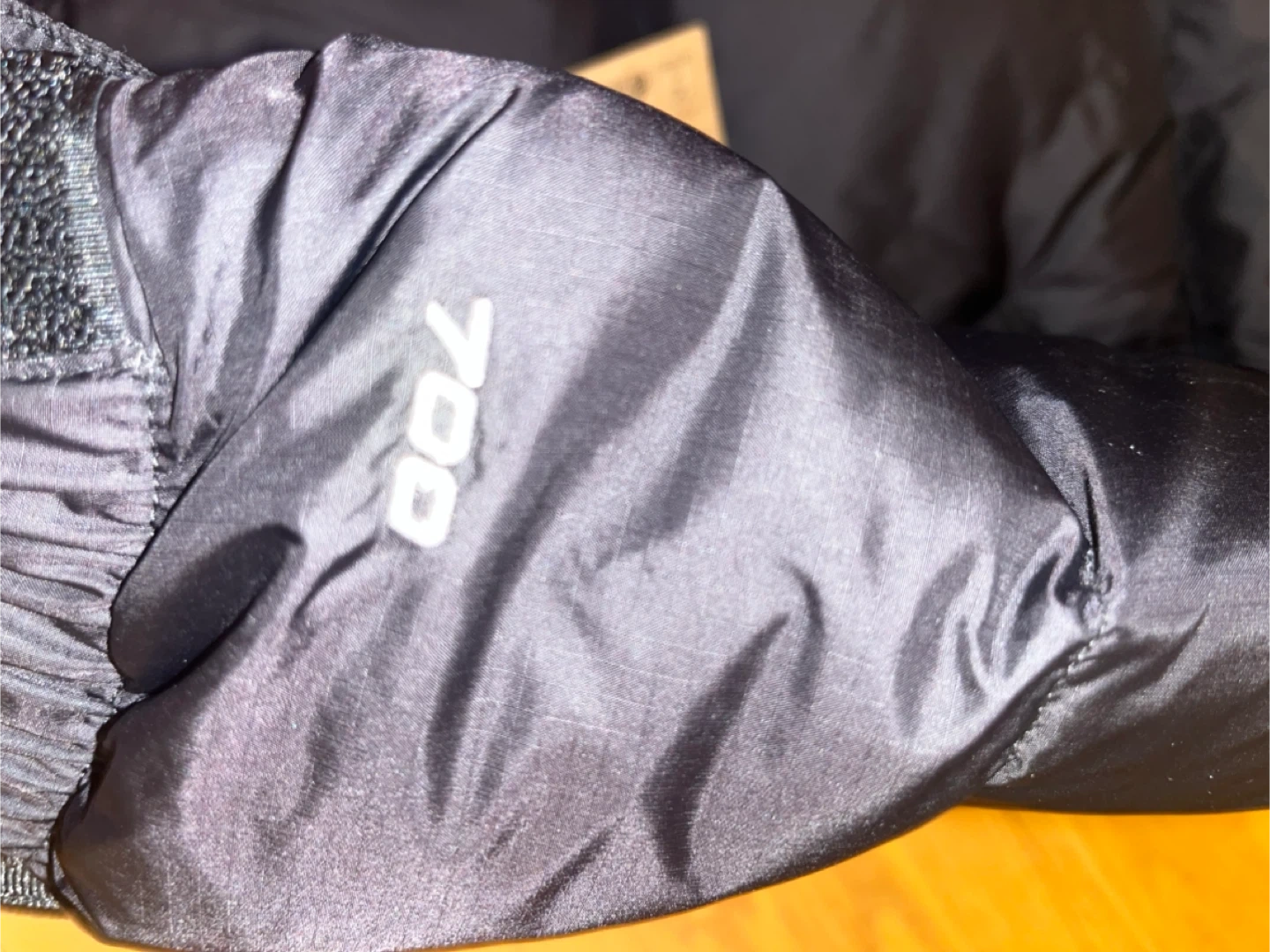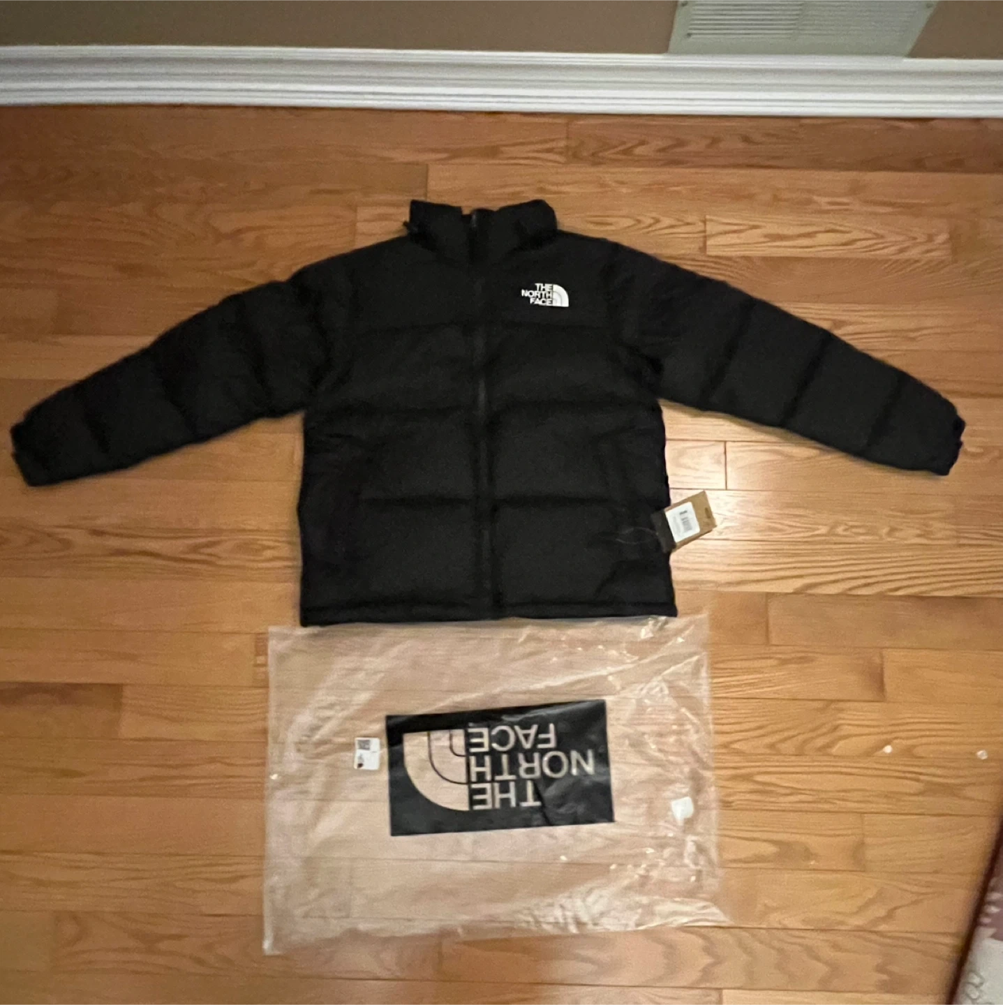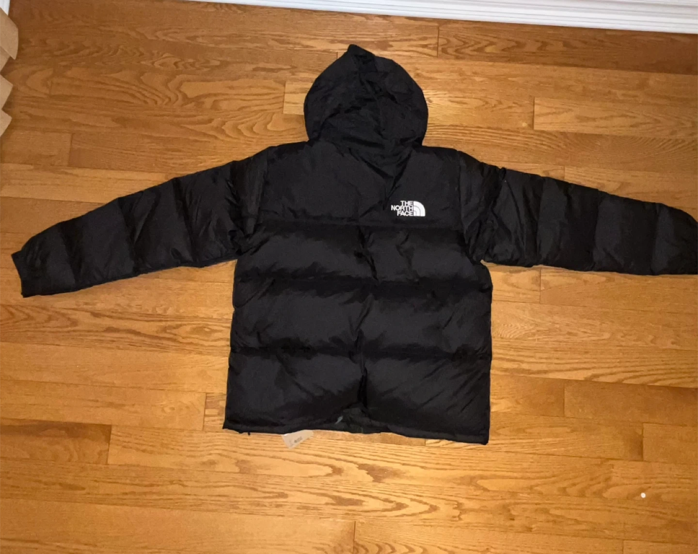 This is a black puffer jacket from The North Face. It's a medium size. It includes a hood and comes in its original bag.