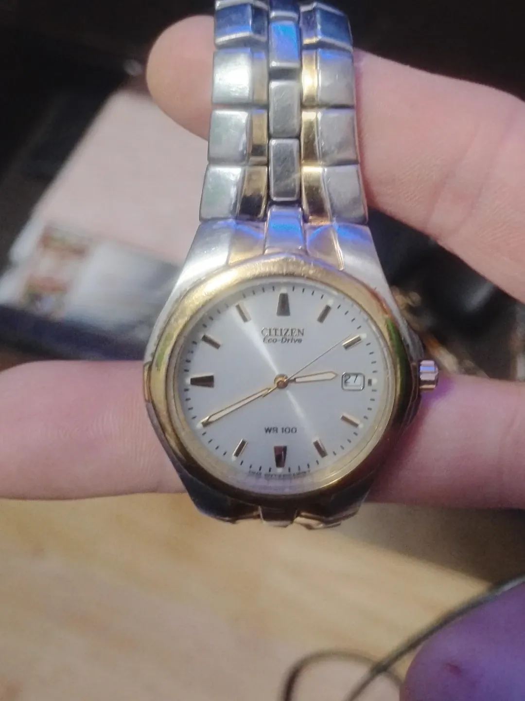 Citizen Eco-Drive watch with a silver and gold band. It's water-resistant to 100 meters and features a date display. This timepiece is suitable for everyday wear and swimming.