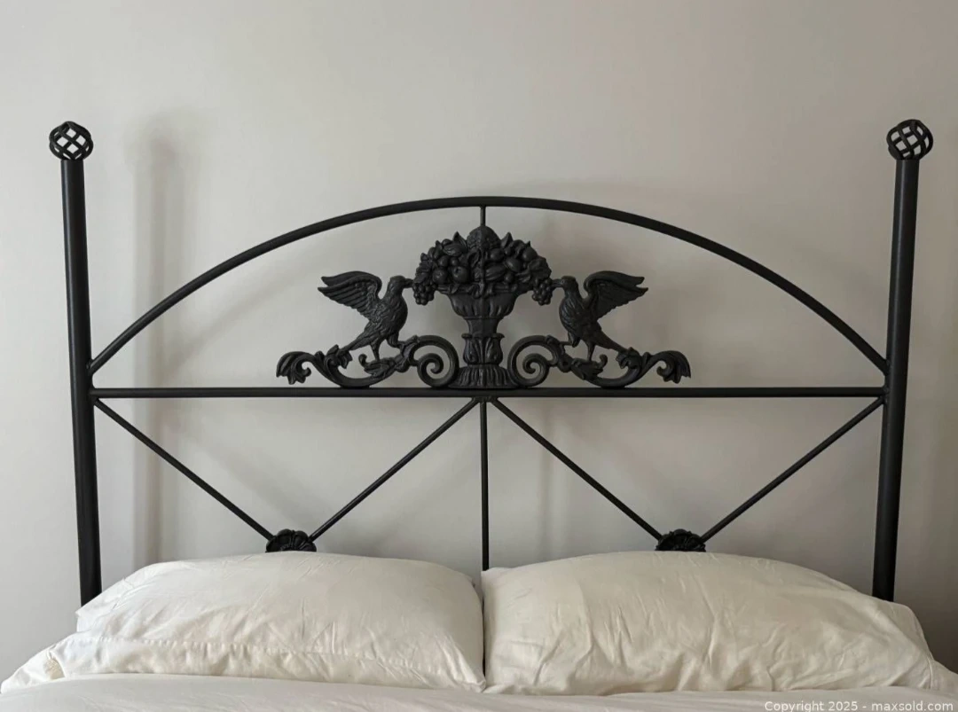 Fabulous metal headboard with two birds flanking a basket of fruit. Includes bed frame, headboard and footboard. Measures 60 in wide x 83 in deep x 63 in tall. Good pre owned condition overall with some scratches to frame mostly on legs. Frame only.