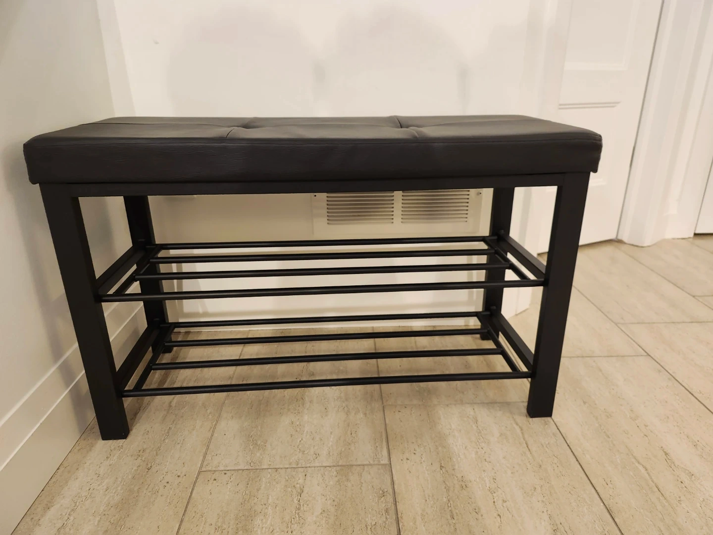 This bench offers a comfortable tufted faux leather seat and a two-tier metal shoe rack underneath. It's great for entryway organization or at the foot of a bed. Black faux leather upholstery. Metal frame.