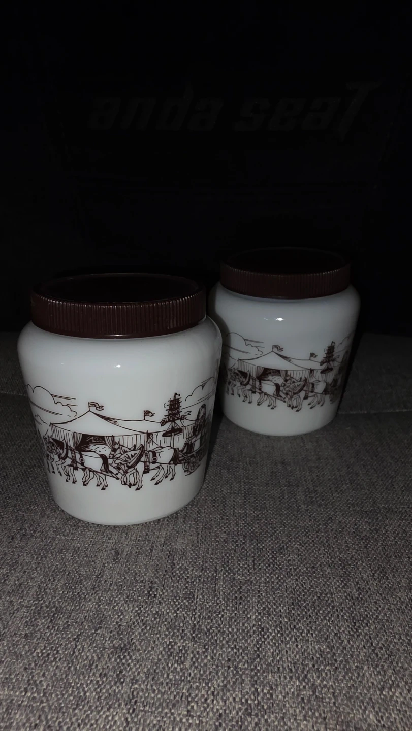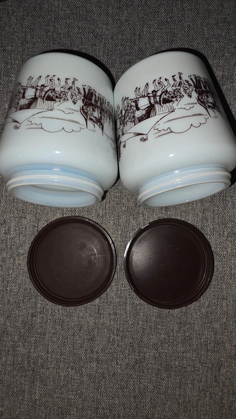 Here's a set of two Vintage Honey jars made in white milk glass, each featuring a charming brown circus-themed design. They come with dark brown screw-on lids. These jars are great for storing small items or for decorative display.