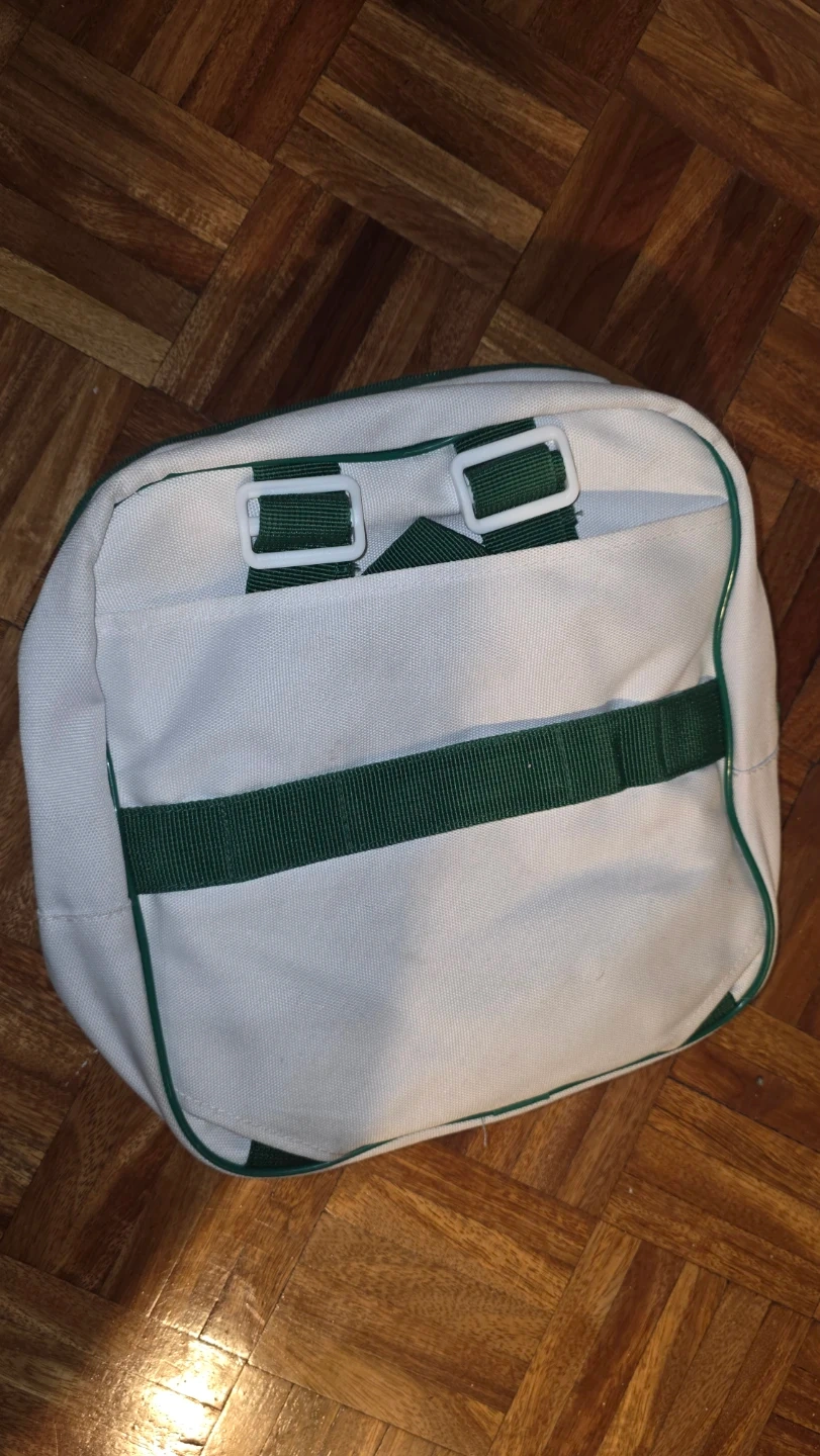 This is a white duffle bag from Lacoste Parfums, featuring the Eau de Lacoste branding. It has green trim and handles. Multiple zippered compartments for storage.