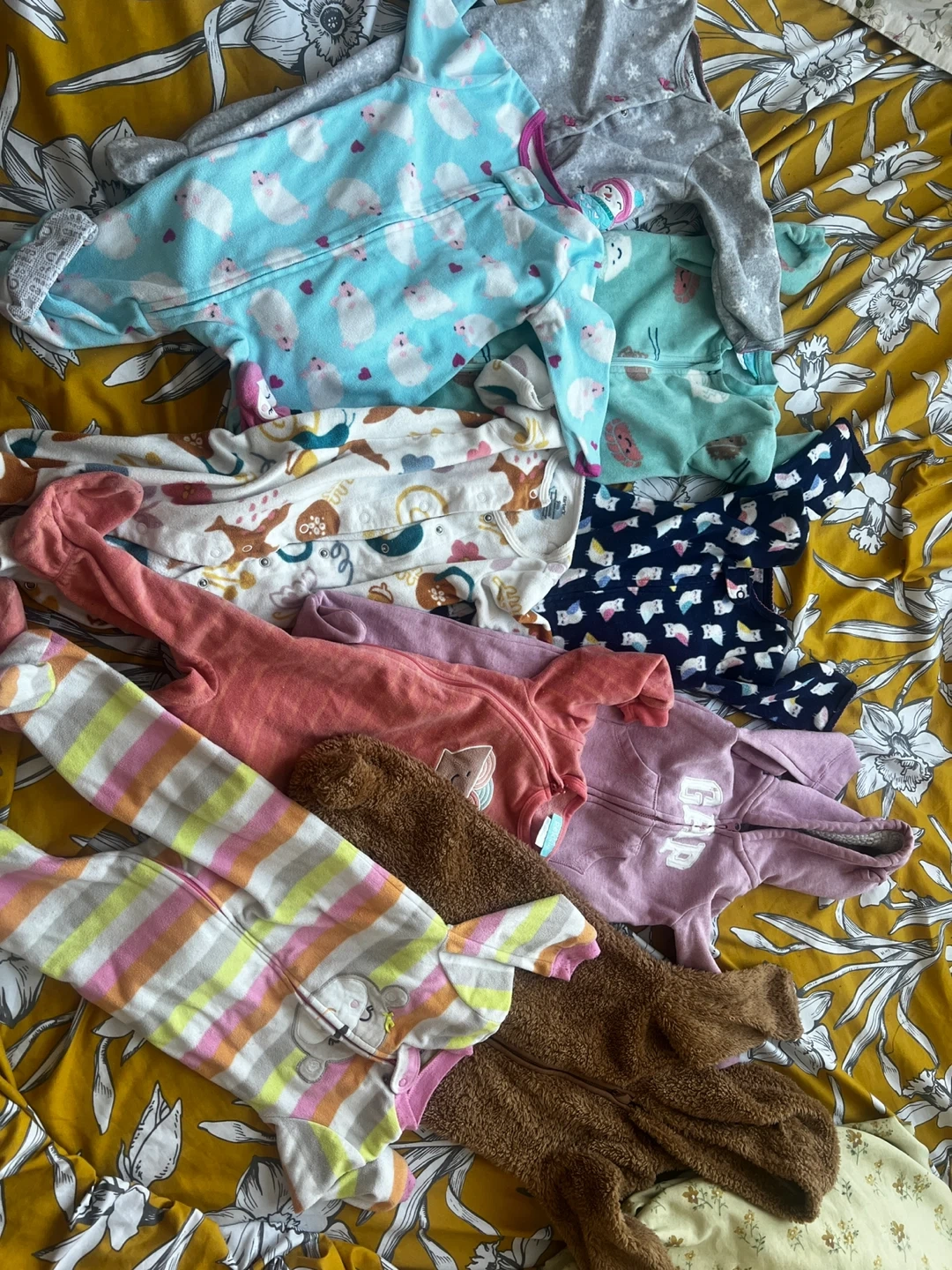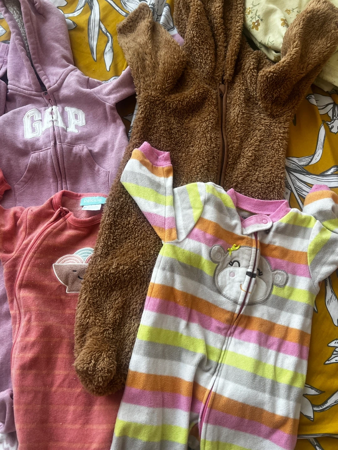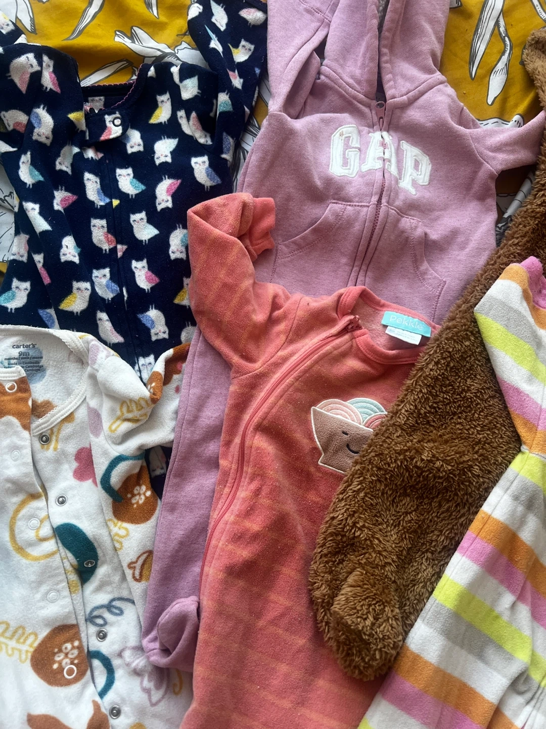 Bundle of 9 baby sleepers. Sleepers include various fun prints like sheep and owls, with zipper and snap closures. The Gap hooded onsie is pink with a zip-up front. All items are soft fleece material.