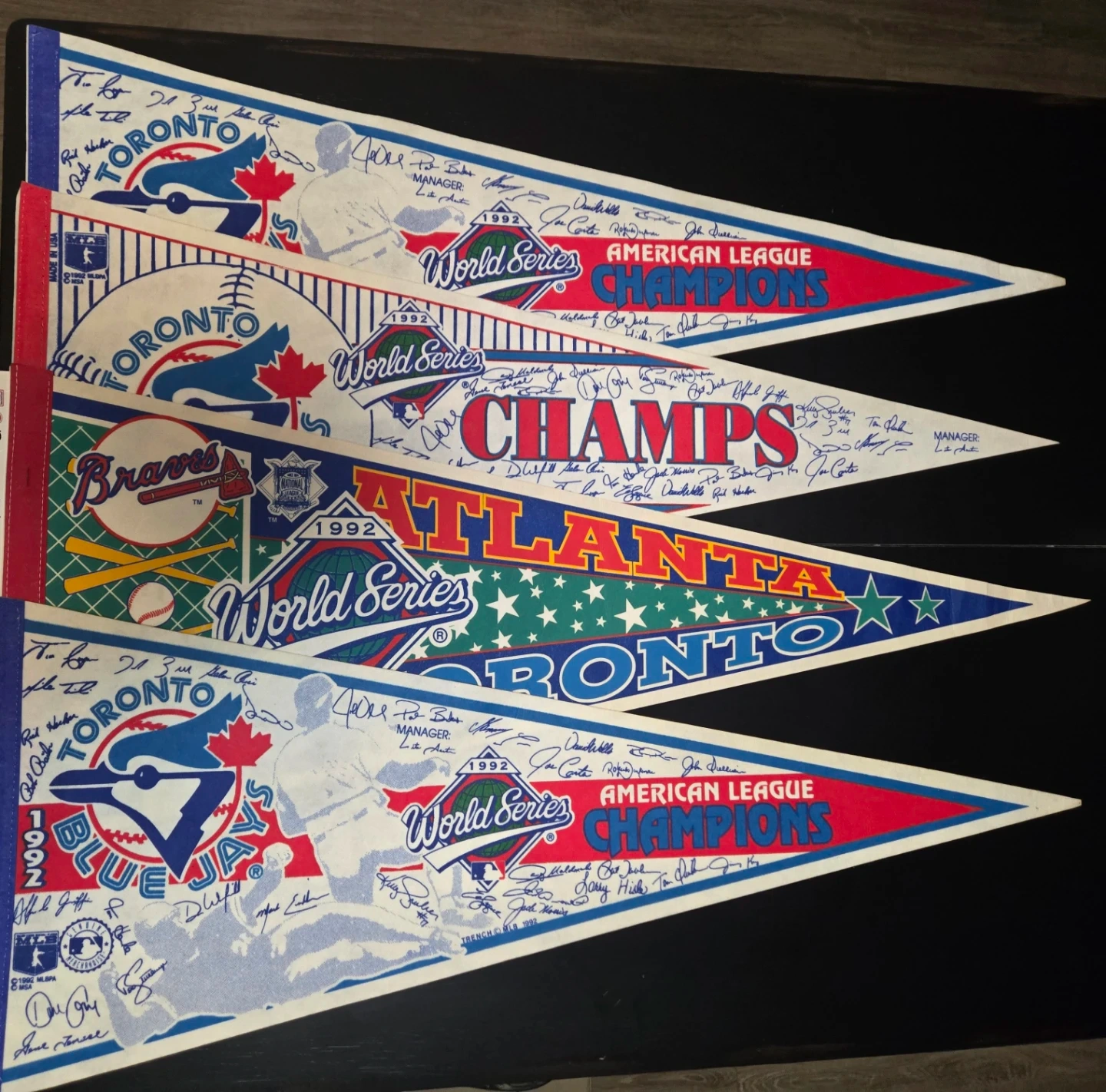This is a collection of four pennants celebrating the 1992 World Series. It includes pennants for the Toronto Blue Jays, Atlanta Braves, and two general American League Champions pennants. These commemorate the historic championship win for the Toronto Blue Jays. Great for any baseball fan! ASKING $60 FIRM FOR ALL FOUR