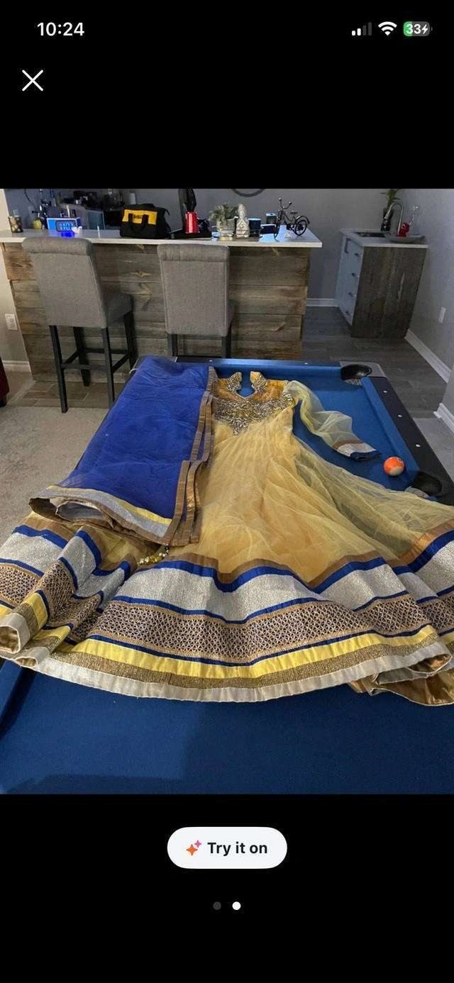This beautiful Anarkali dress features intricate detailing and a flowing silhouette. The dress is adorned with delicate embellishments and is perfect for special occasions or festive events. Additional details: - Colour: Yellow and Blue - Fabric: Lightweight material - Size: Approximately a size Medium (8-10) - Condition: Gently worn, good condition. If the ad is up, the dress is available!