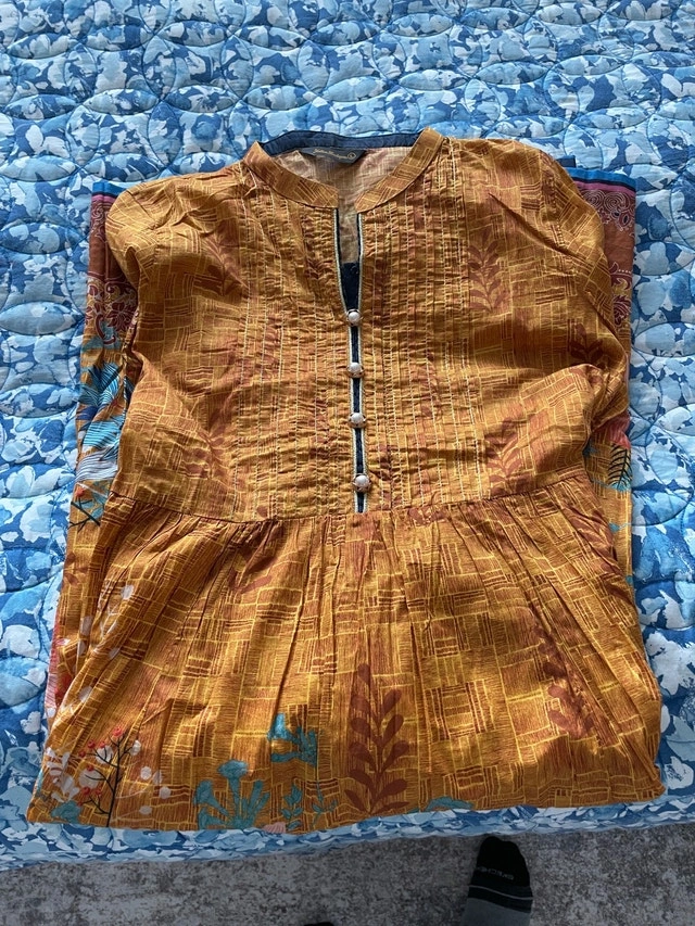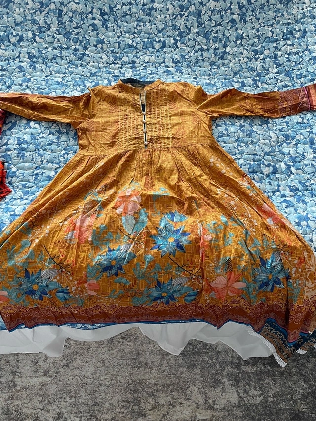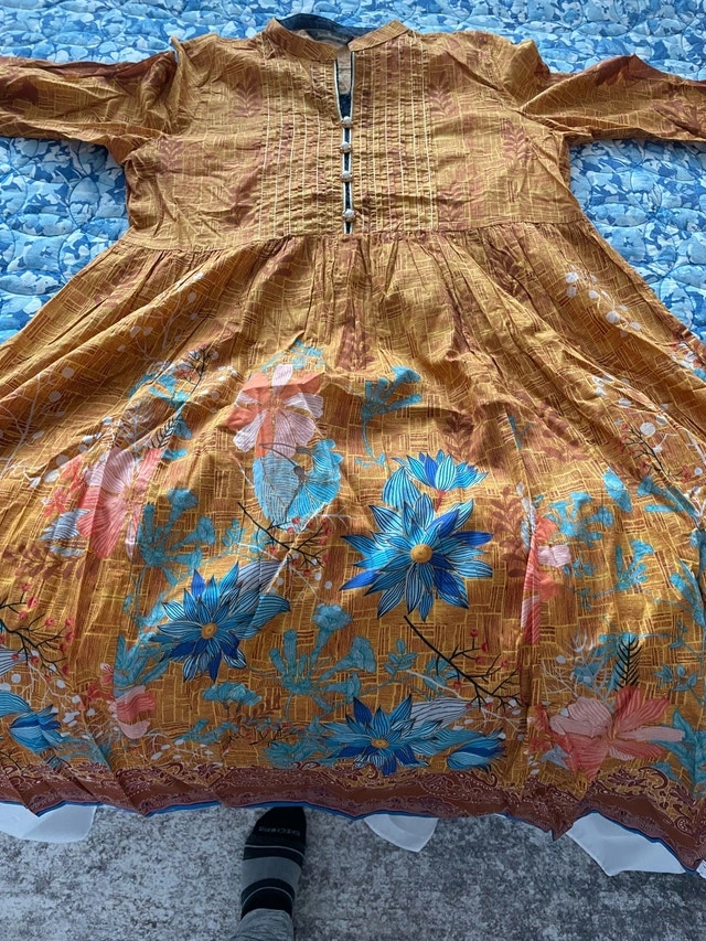 Elevate your wardrobe with this stunning, used ethnic dress, featuring a vibrant floral pattern in shades of blues and pinks on an gold/mustard background, perfect for adding a touch of cultural flair to any occasion. Size Large (12-14). Cash accepted.