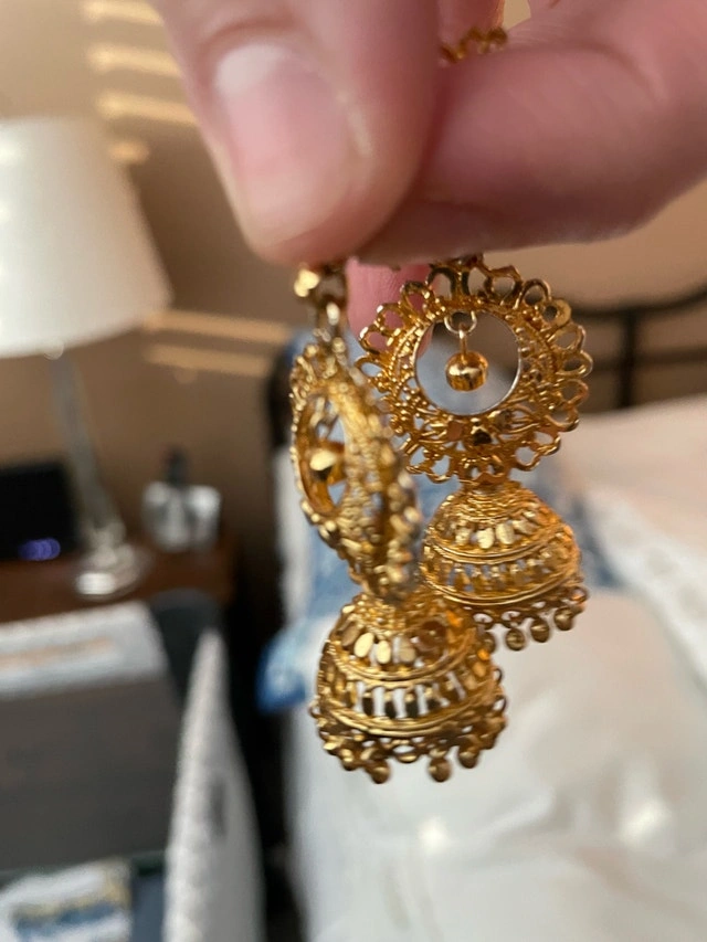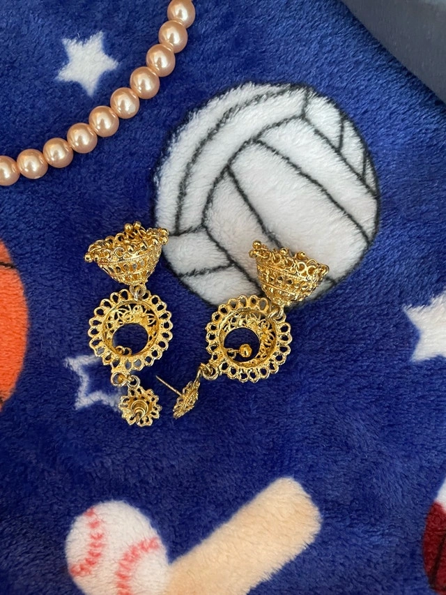 These used gold jhumka earrings feature a traditional bell shape with intricate filigree detailing, perfect for adding a touch of cultural elegance to any outfit. Condition: Used - Good. Cash accepted.