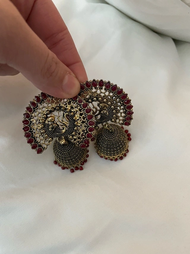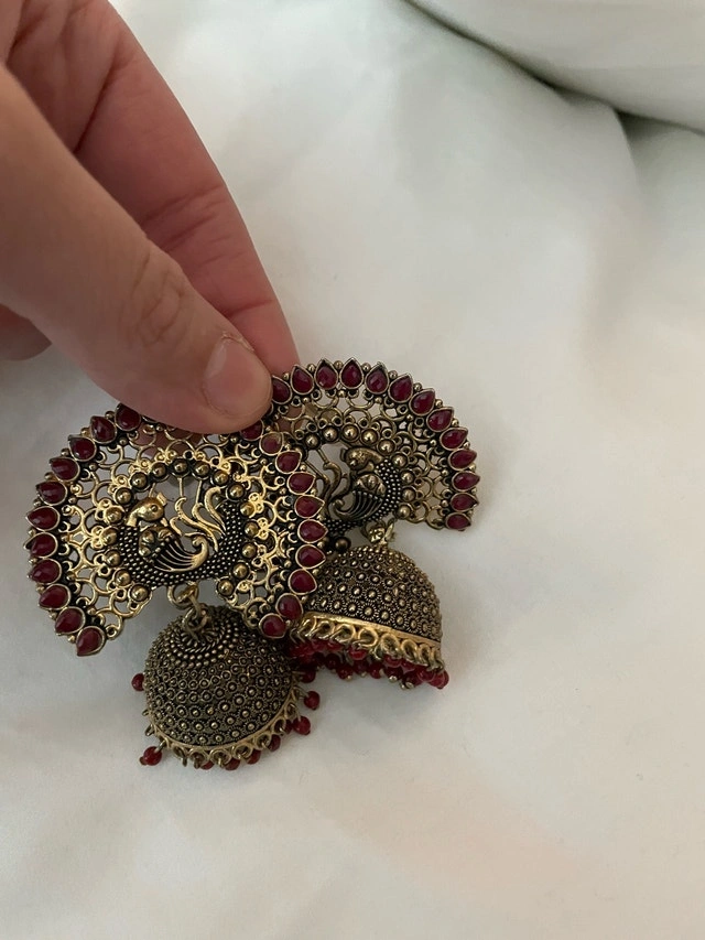 These used Jhumka earrings feature a gold tone with beautiful magenta stones, perfect for adding a touch of elegance to any outfit. Although they are used, they are in good condition and ready to be worn. If this ad is still up, then yes, it's still available! Cash accepted.