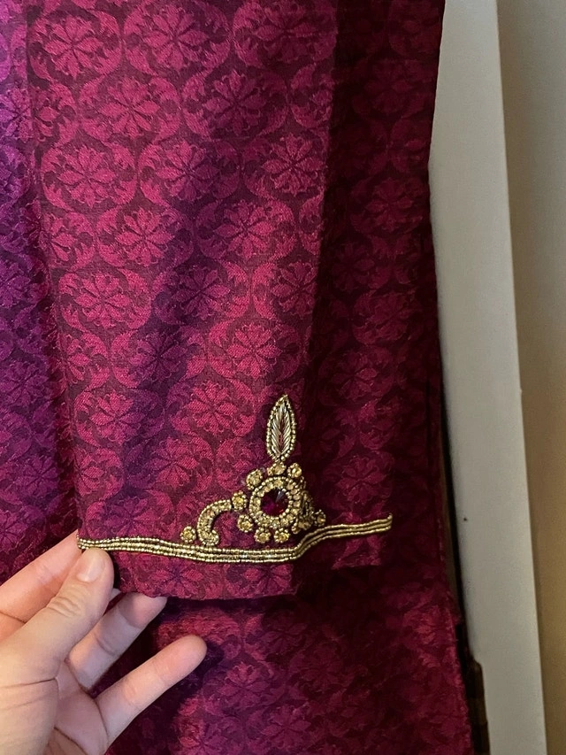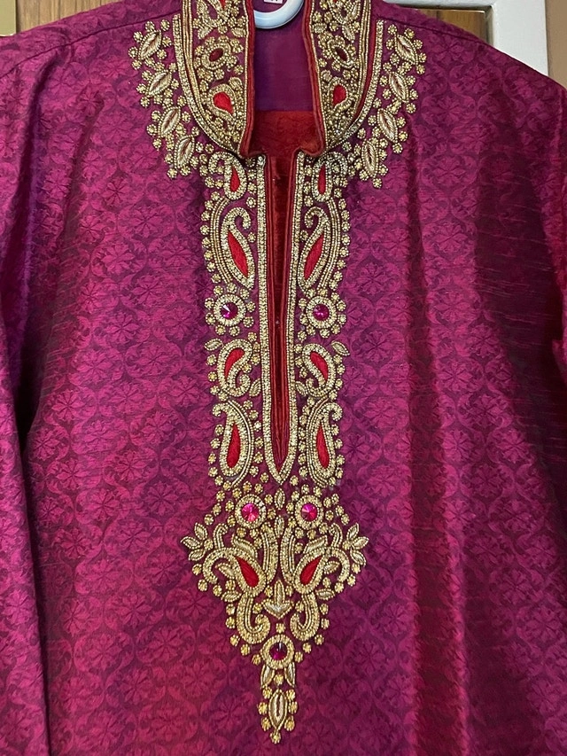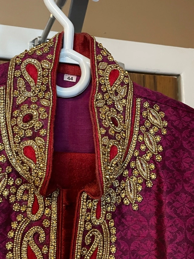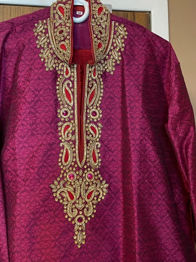 This exquisite men's kurta, adorned with intricate gold and red detailing, is perfect for special occasions! While it has been worn, it remains in great condition, ready to make a statement at your next event. The luxurious fabric and detailed embroidery speak volumes of its quality. Size: Large. Cash accepted.