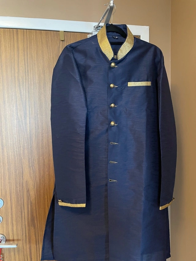 This elegant Sherwani features intricate gold detailing and is in excellent condition, perfect for special occasions. It is a size 40, designed for a sophisticated and comfortable fit. Key Features: Size: 40 Colour: Navy Blue Detailing: Gold accents on collar, buttons, and cuffs Condition: Gently worn, excellent condition. Cash accepted. Curbside pick up available.