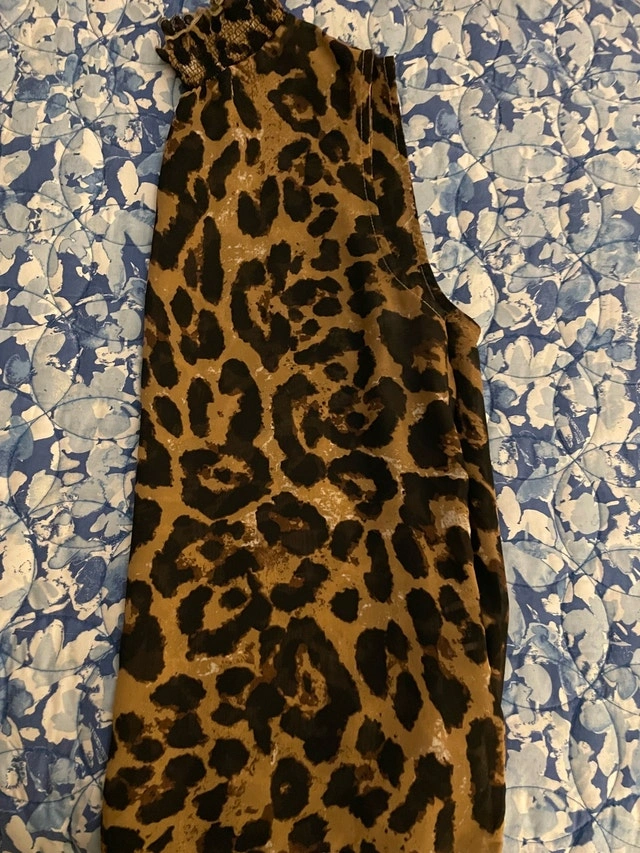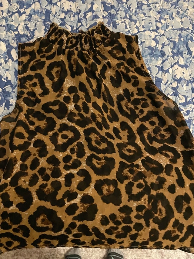 Add a touch of the wild to your wardrobe with this pre-owned leopard print top! It features a stylish high neckline and is perfect for a night out or a chic daytime look. This used item is in great condition and is waiting for a new home. If the ad is up, it's available! Size Medium (8-10). Cash accepted.