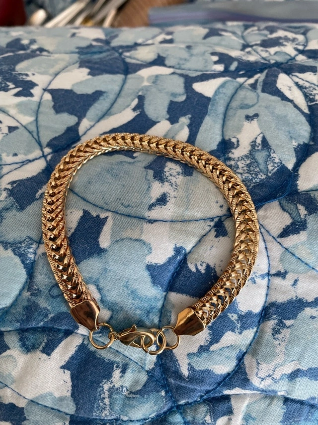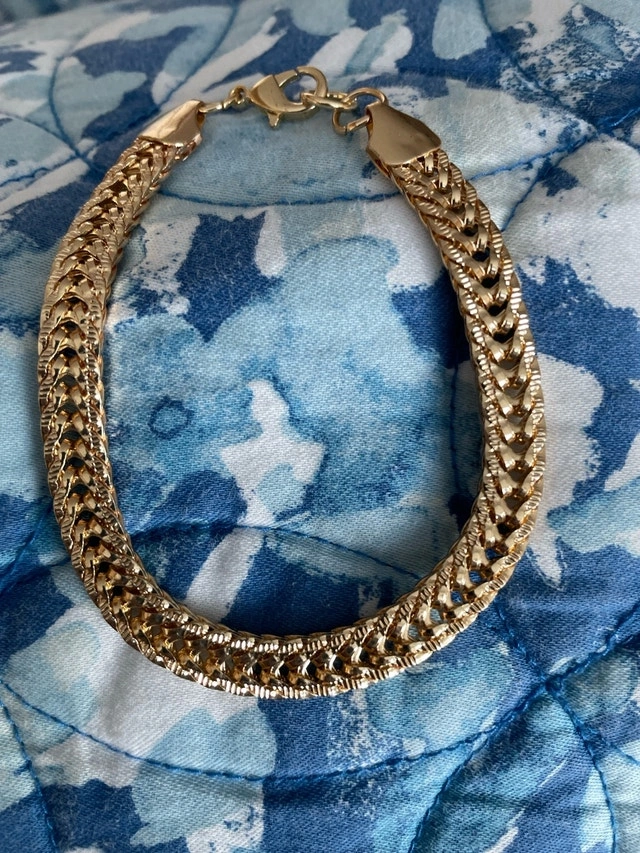Check out this stylish gold bracelet! It's in good condition, as you can see from the pictures. This bracelet is the perfect accessory to add a touch of class to any outfit. If the ad's still up, it's still up for grabs. Cash accepted.
