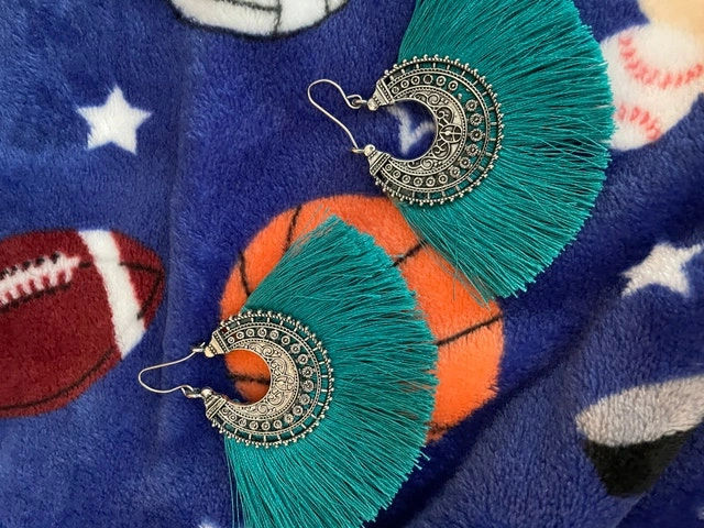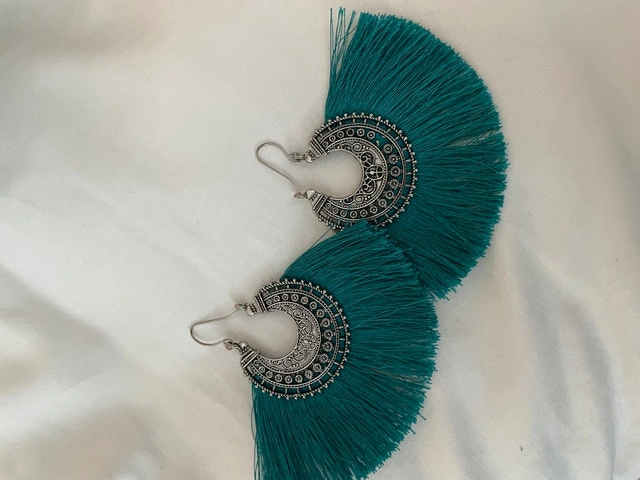 Add a touch of bohemian flair to your look with these stylish tassel earrings! These earrings feature a unique silver-tone half-moon stud design with vibrant turquoise-green tassels, perfect for accessorizing any outfit. These are previously owned and have been gently worn. Silver-Tone Studs Turquoise-Green Tassels. If the ad is up, the earrings are available!