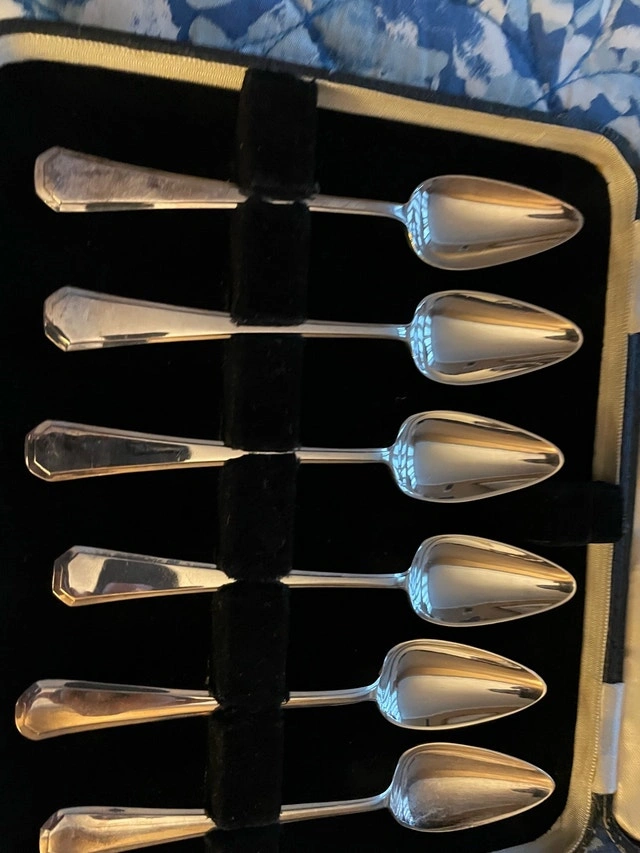 Here are six antique silver spoons, perfect for adding a touch of elegance to your afternoon tea or collection! This set is in its original fitted case, although the silver does show some signs of age and use, which only adds to their vintage charm. Cash accepted.
