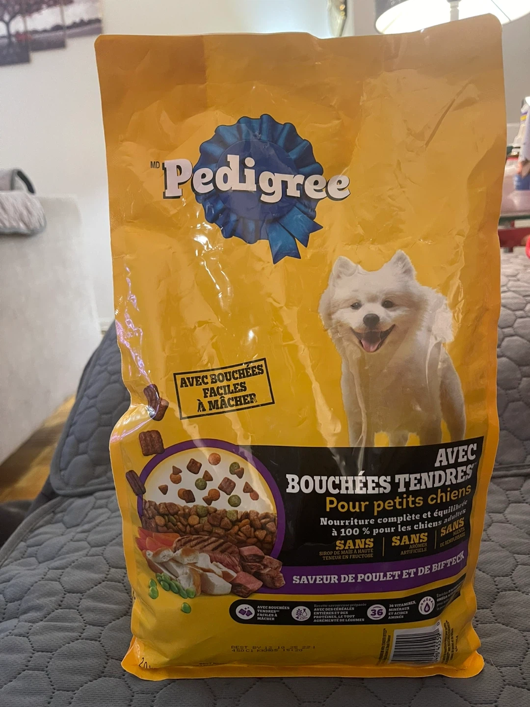 Pedigree Tender Bites for small dogs. Nourishment complete and balanced for puppies up to 100% for puppies. It's made with chicken and beef flavour. No artificial colours or flavours.