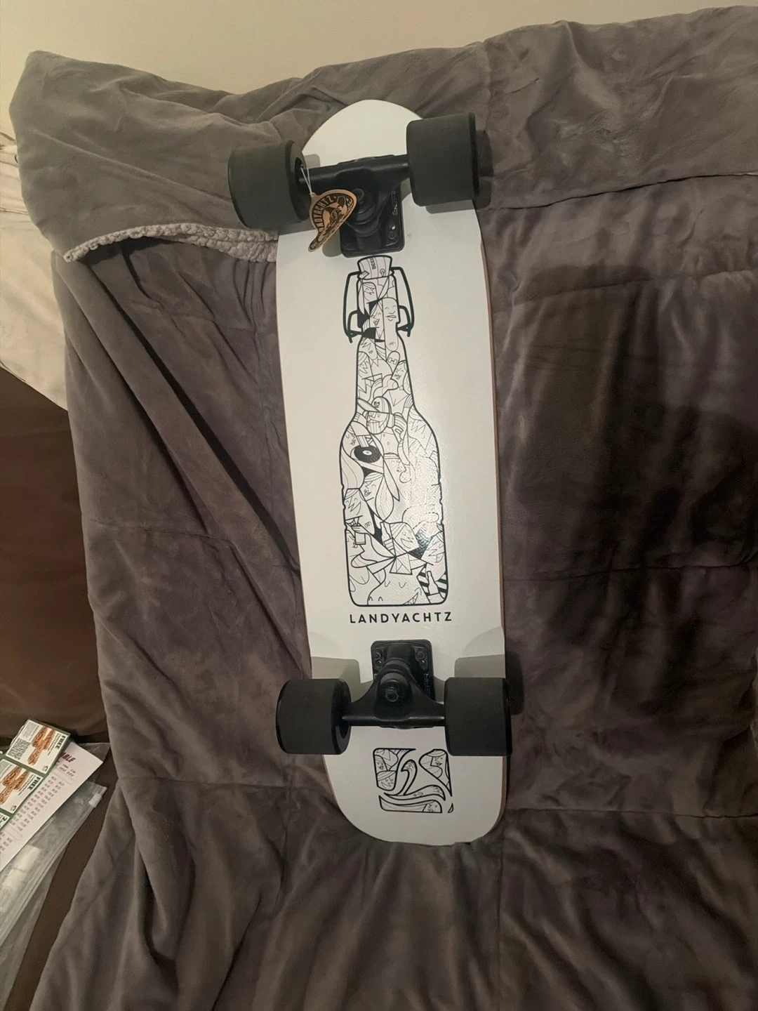 This is a Landyachtz skateboard featuring white deck with a bottle graphic. It's equipped with Hawgs 60mm diameter wheels and 78A durometer for a smooth ride. The deck measures 9" wide.