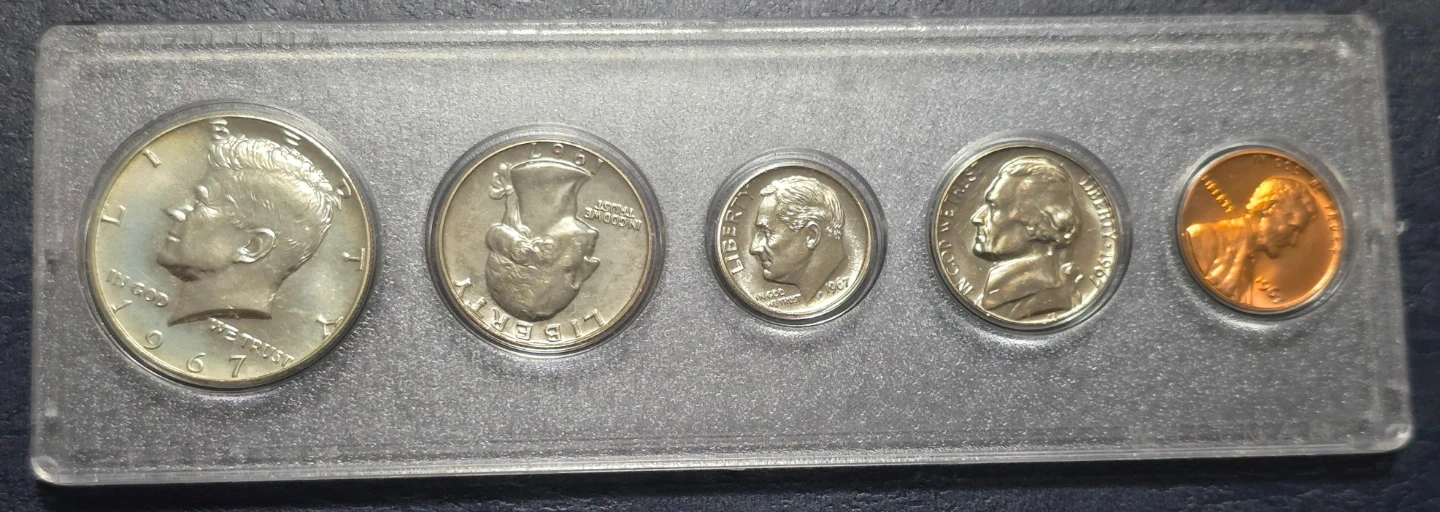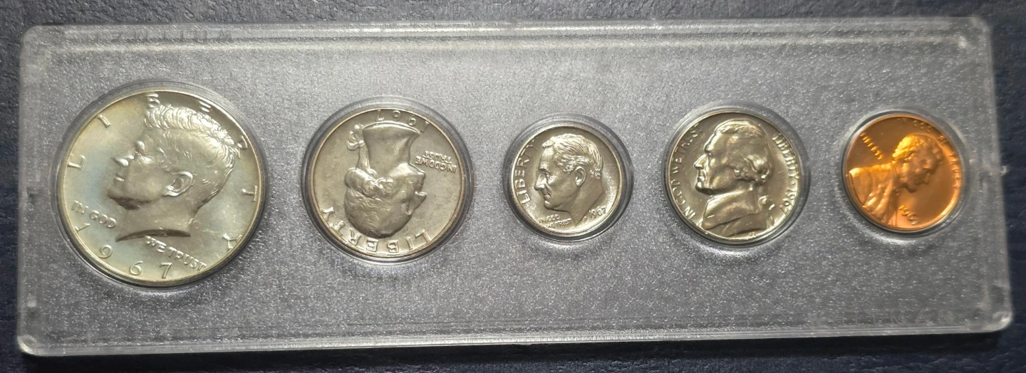 This is a set of five US coins from 1967. It includes a Kennedy Half Dollar(40% silver), a Washington Quarter, a Roosevelt Dime, a Jefferson Nickel, and a Lincoln Penny. The coins are encased in a clear plastic holder.