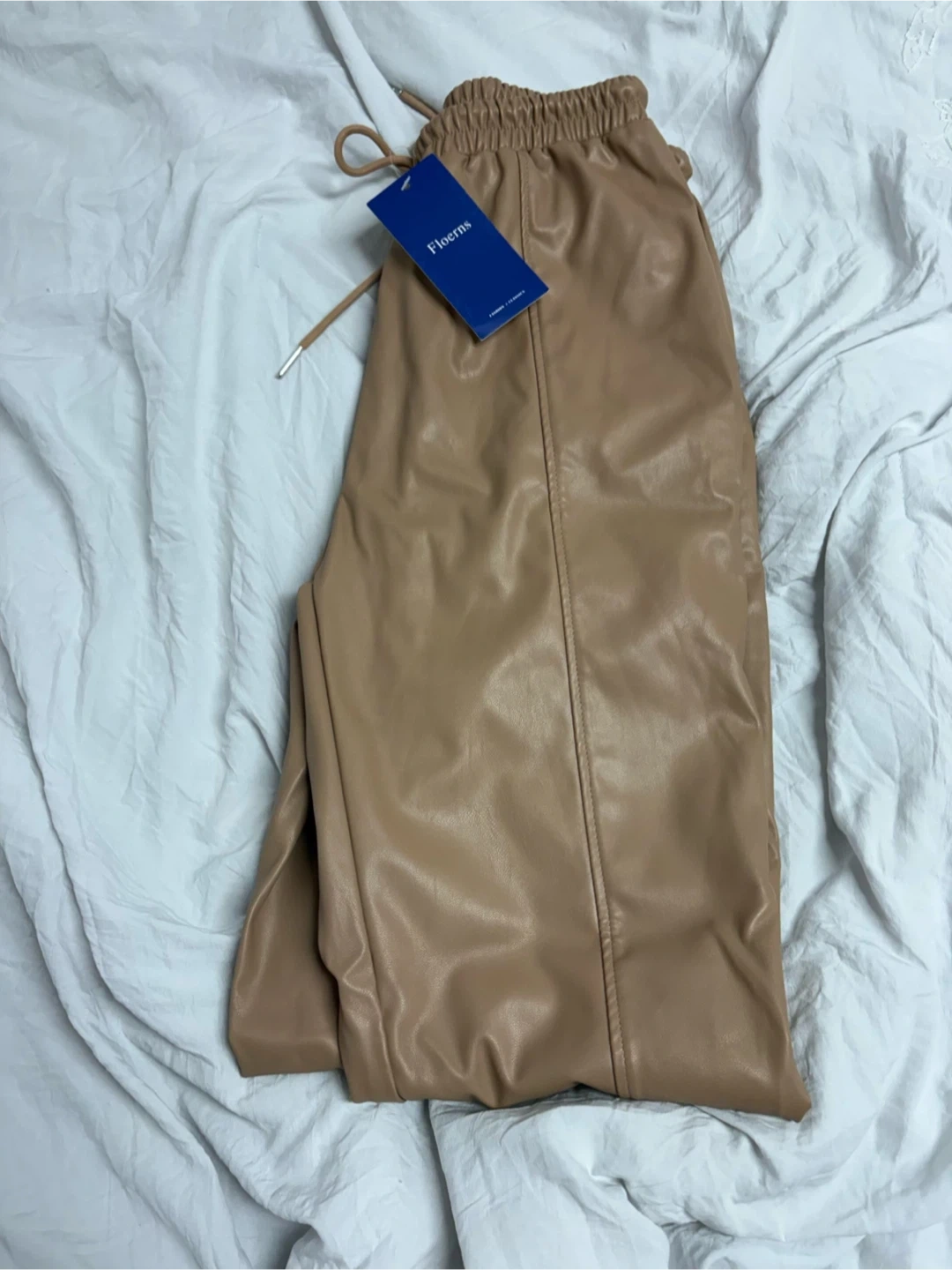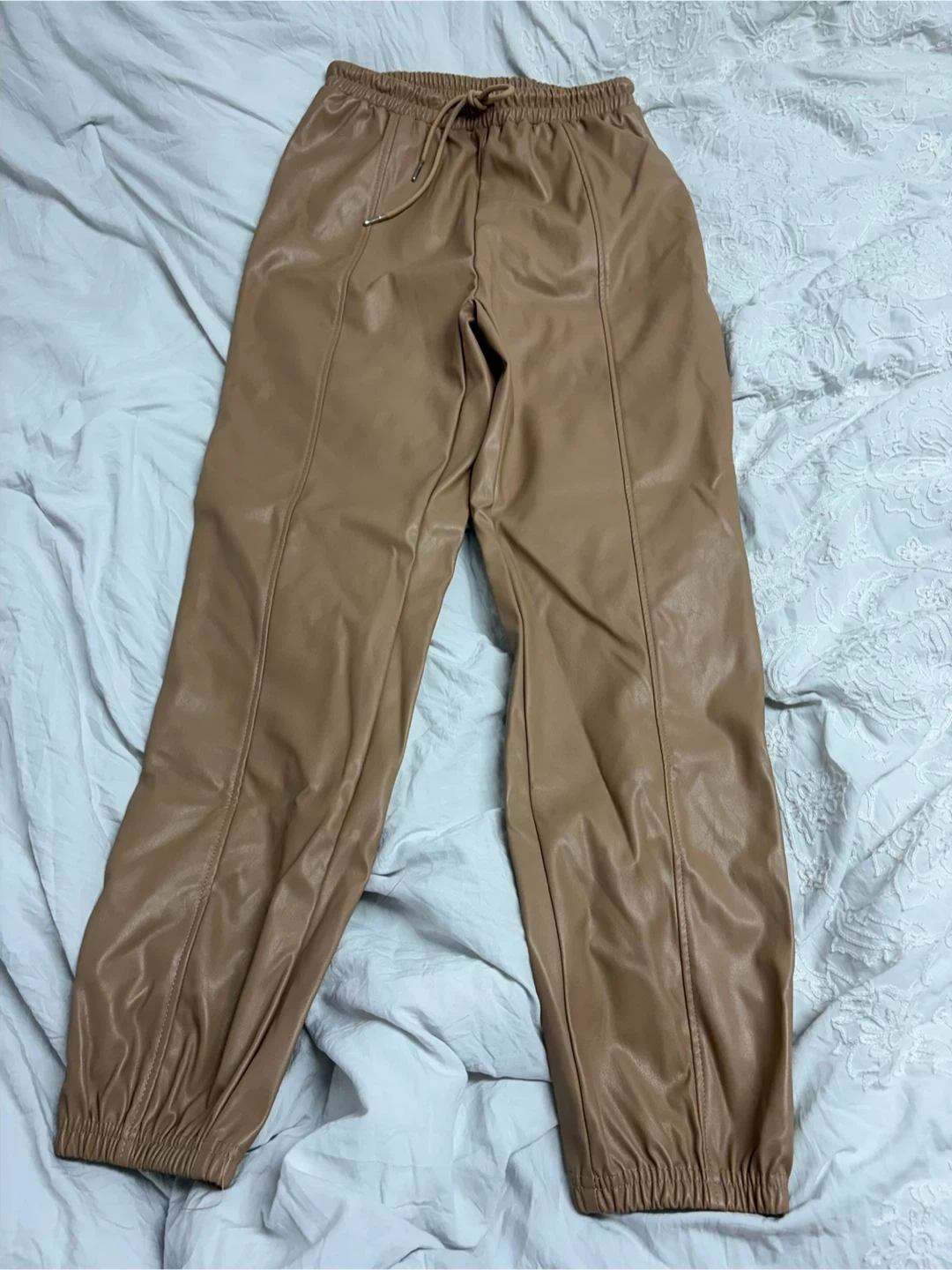 These Floema joggers are made of a faux leather material in a tan colour. They're a size small with an elasticated waistband and drawstring. Elasticated cuffs too! Size small pick up cash only
