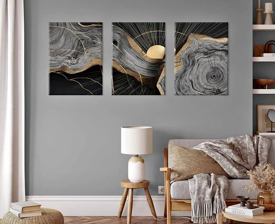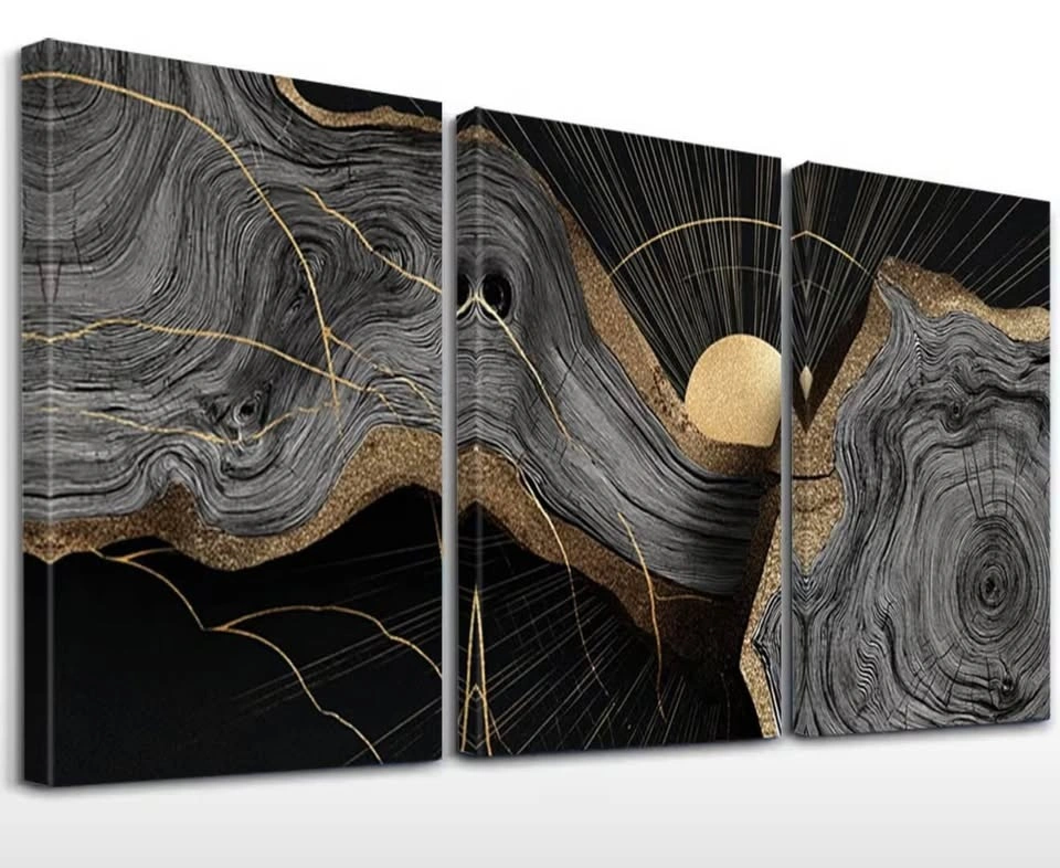 Set of 3 framed modern abstract canvas paintings. Features golden lines and dark-toned textured waves. Great for living room, bedroom, or kitchen decor. Makes a nice gift.