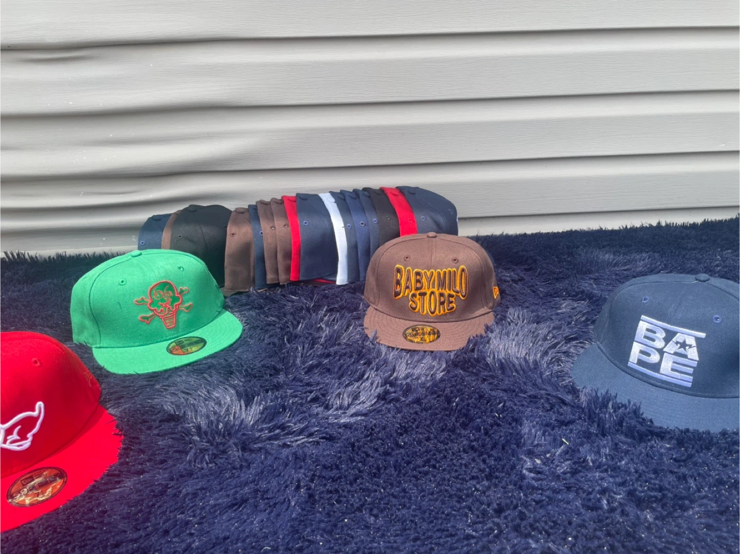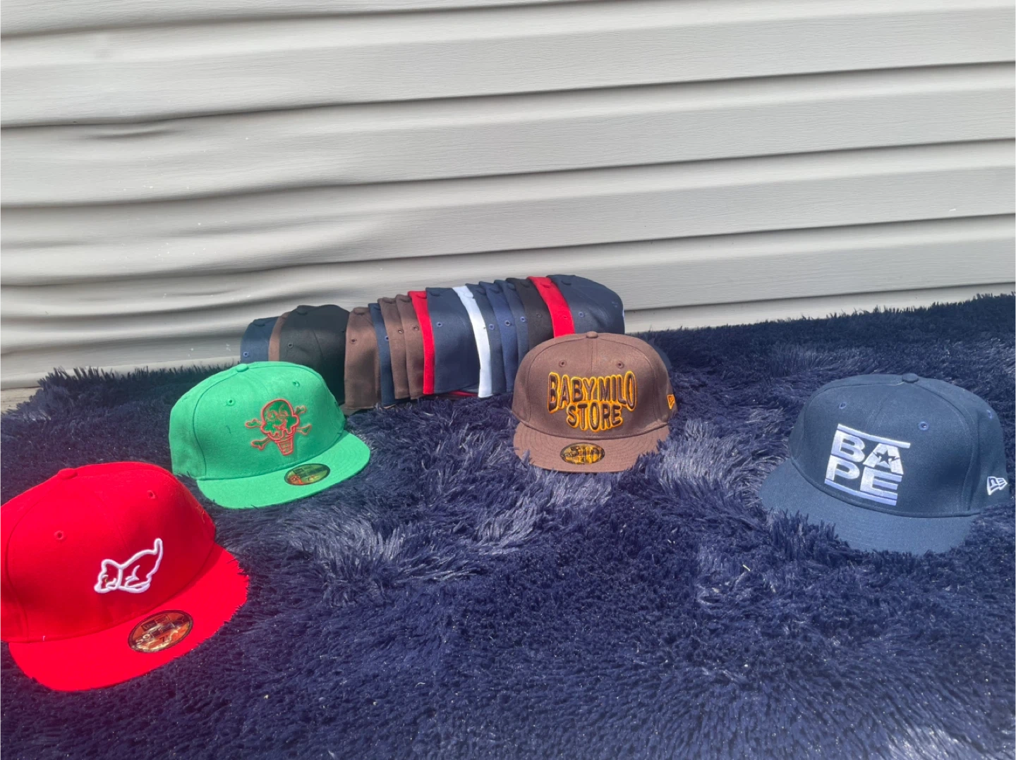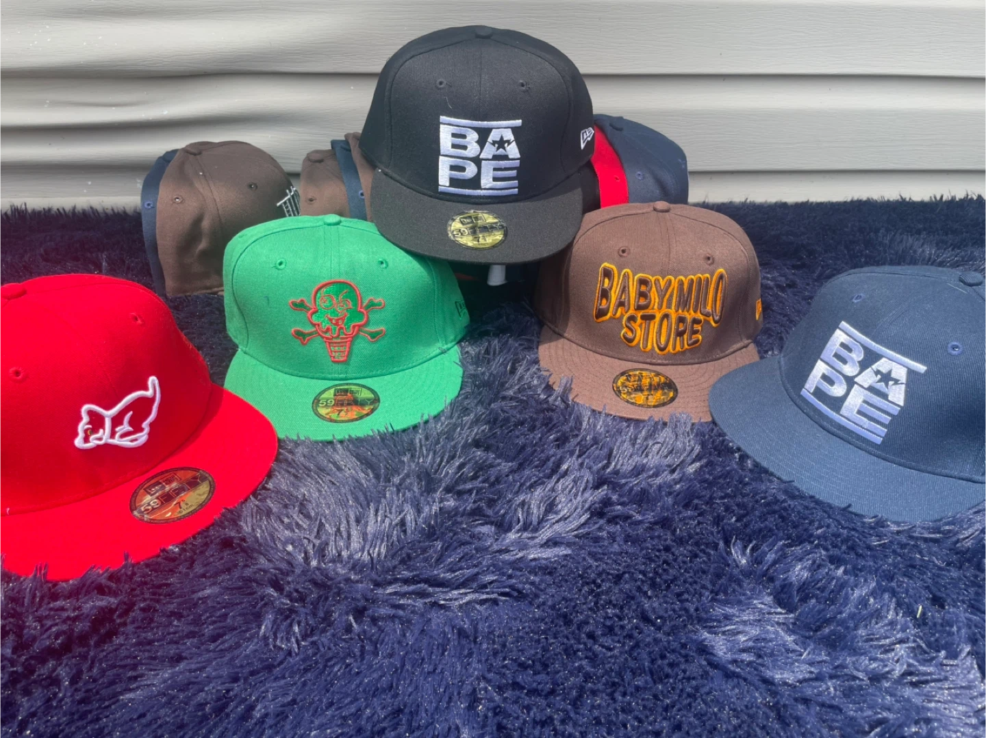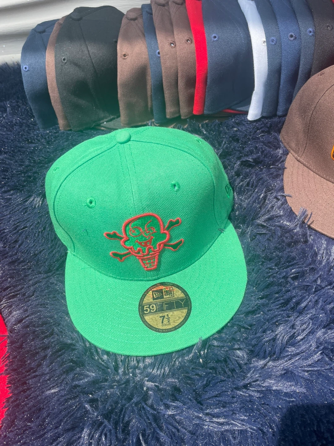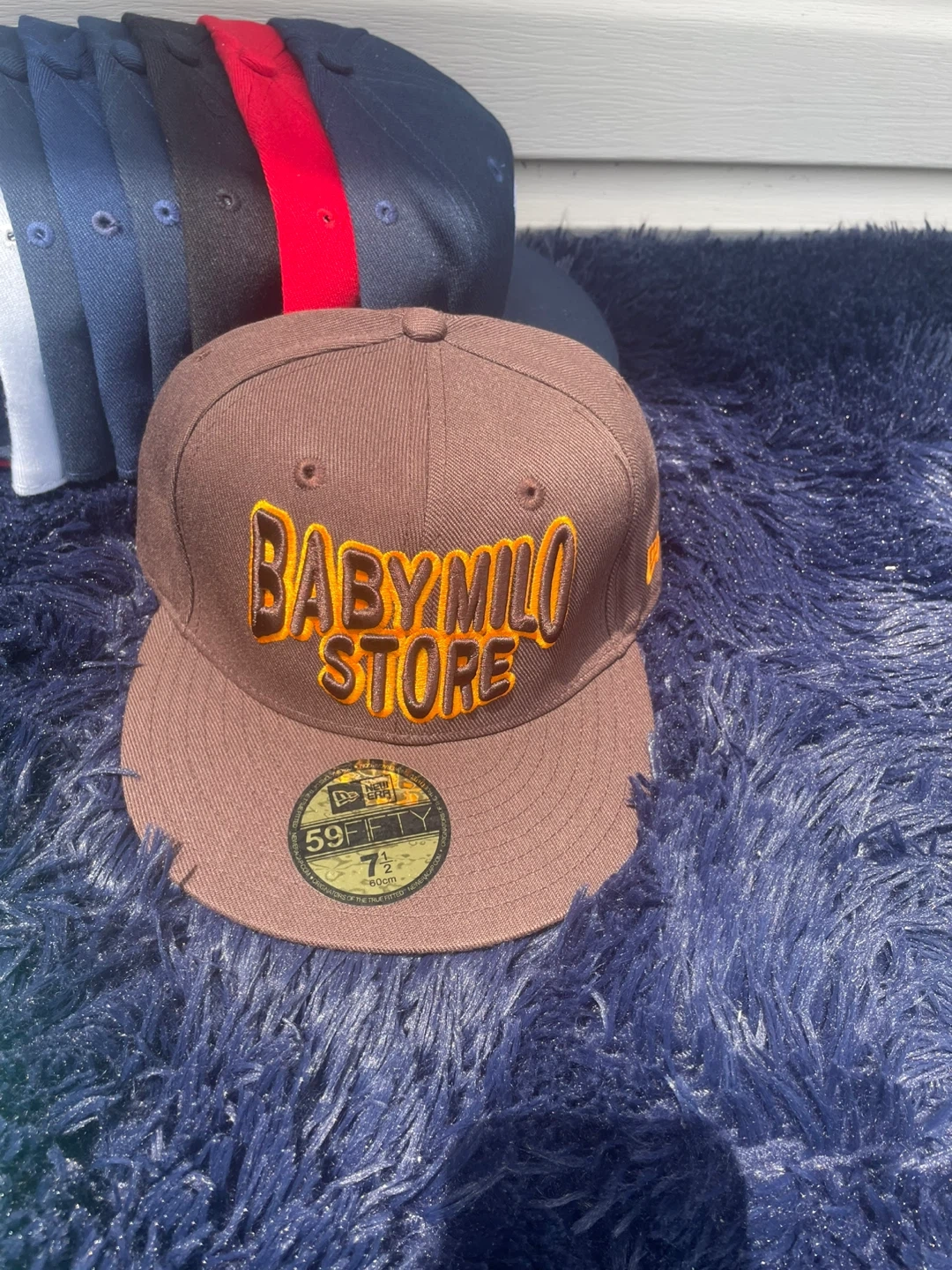 Selling a collection of New Era 59FIFTY fitted hats. Includes various styles and colours like green, brown with "BABYMILO STORE" text, and navy with "BAPE" logo. The green hat has a red skull design. Most hats appear to be size 7 1/4 or 7 1/2. Great for hat enthusiasts!