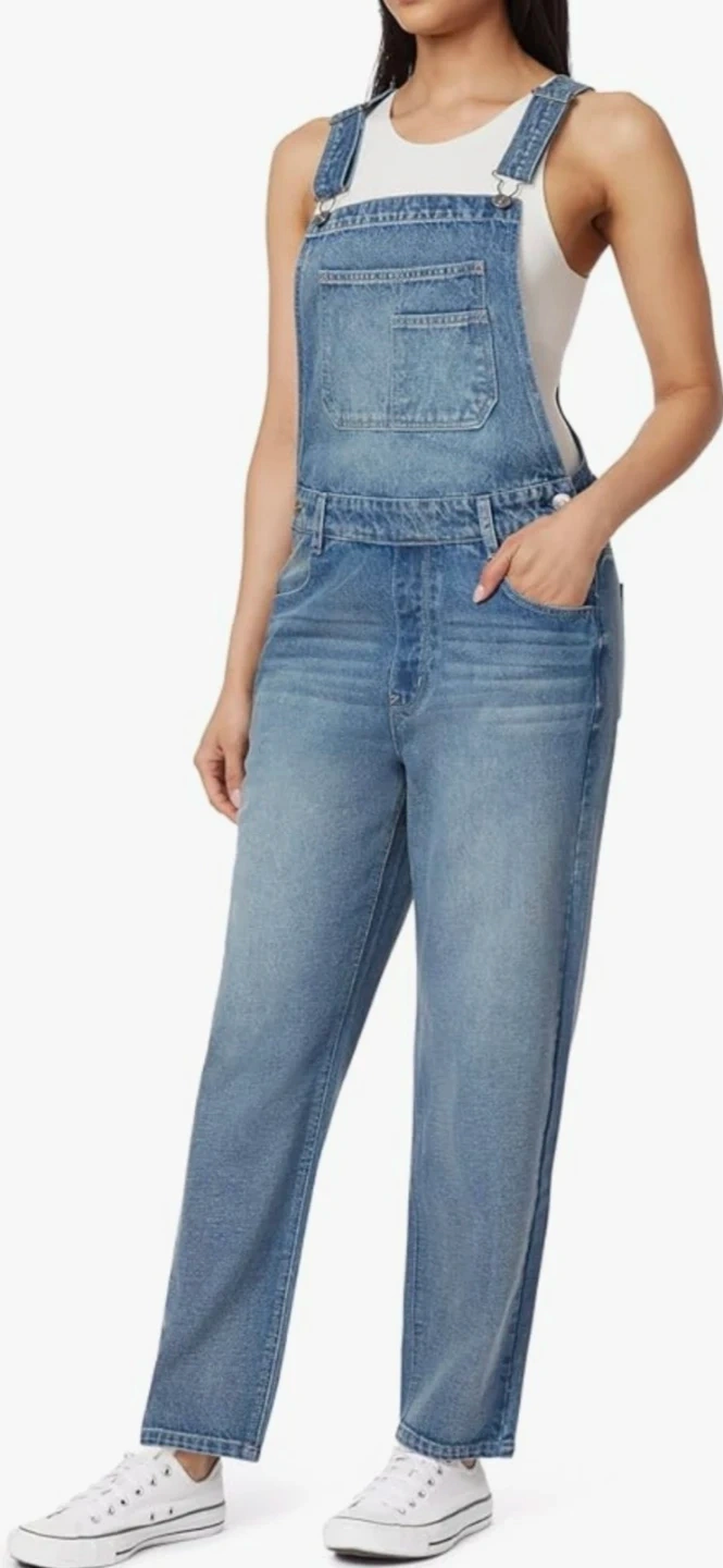 Women's light wash denim overalls. New Fit, The Girlfriend Straight Overalls. These feature adjustable straps and a classic bib front. Made from comfortable 100% cotton denim.