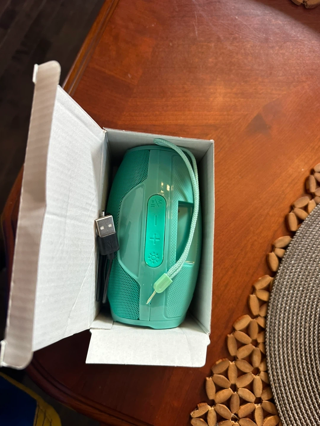 This teal portable Bluetooth speaker comes with a USB charging cable and is ready for use. It has a durable design and a convenient carrying strap. Perfect for listening to music on the go!