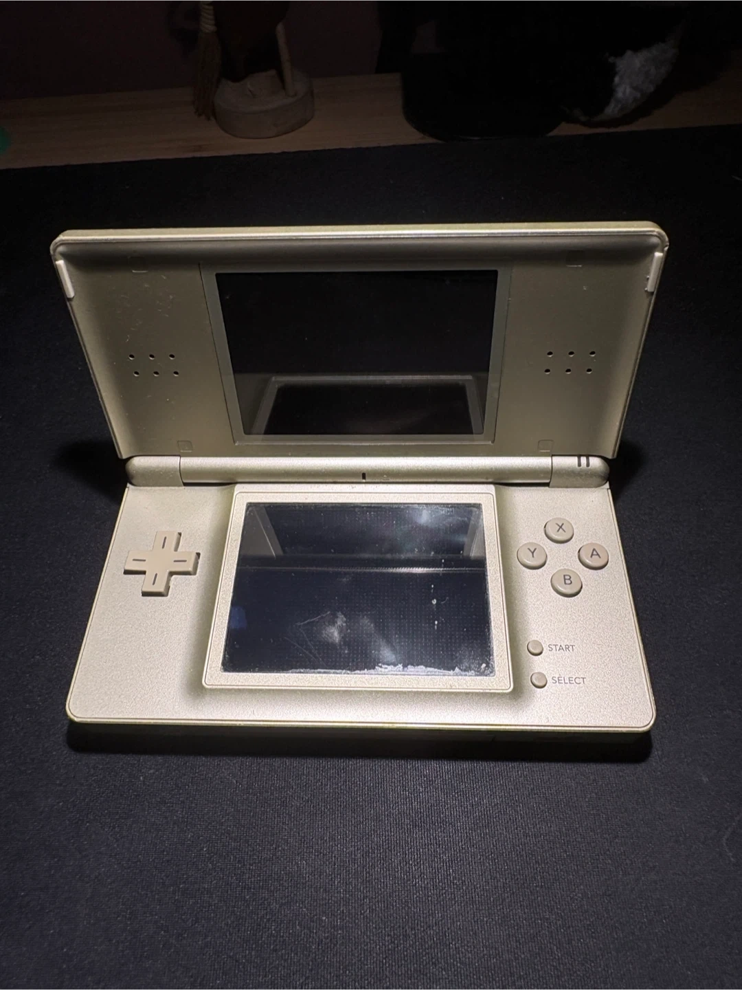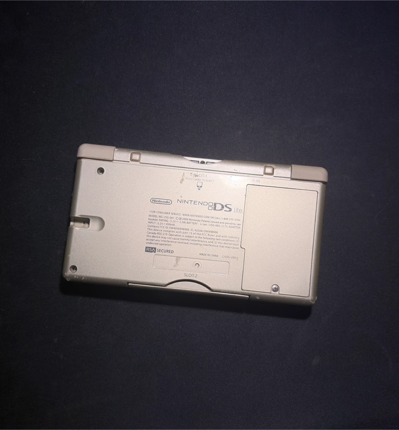 Gold Nintendo DS Lite console. Includes the following games: Super Mario, Mario Kart 2, Lego Ninjago, and Big Brain Academy. It's great for gaming on the go!