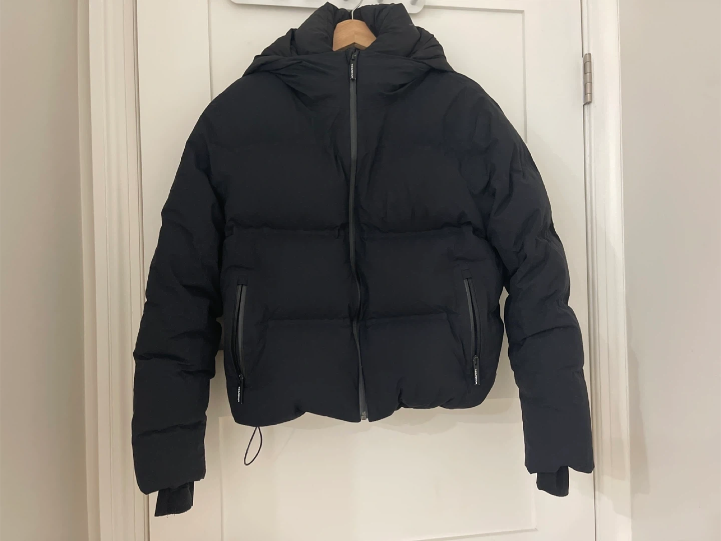 This black aritzia shorty puffer jacket has a hood and zippered pockets. It's made for warmth. A great jacket for chilly weather!