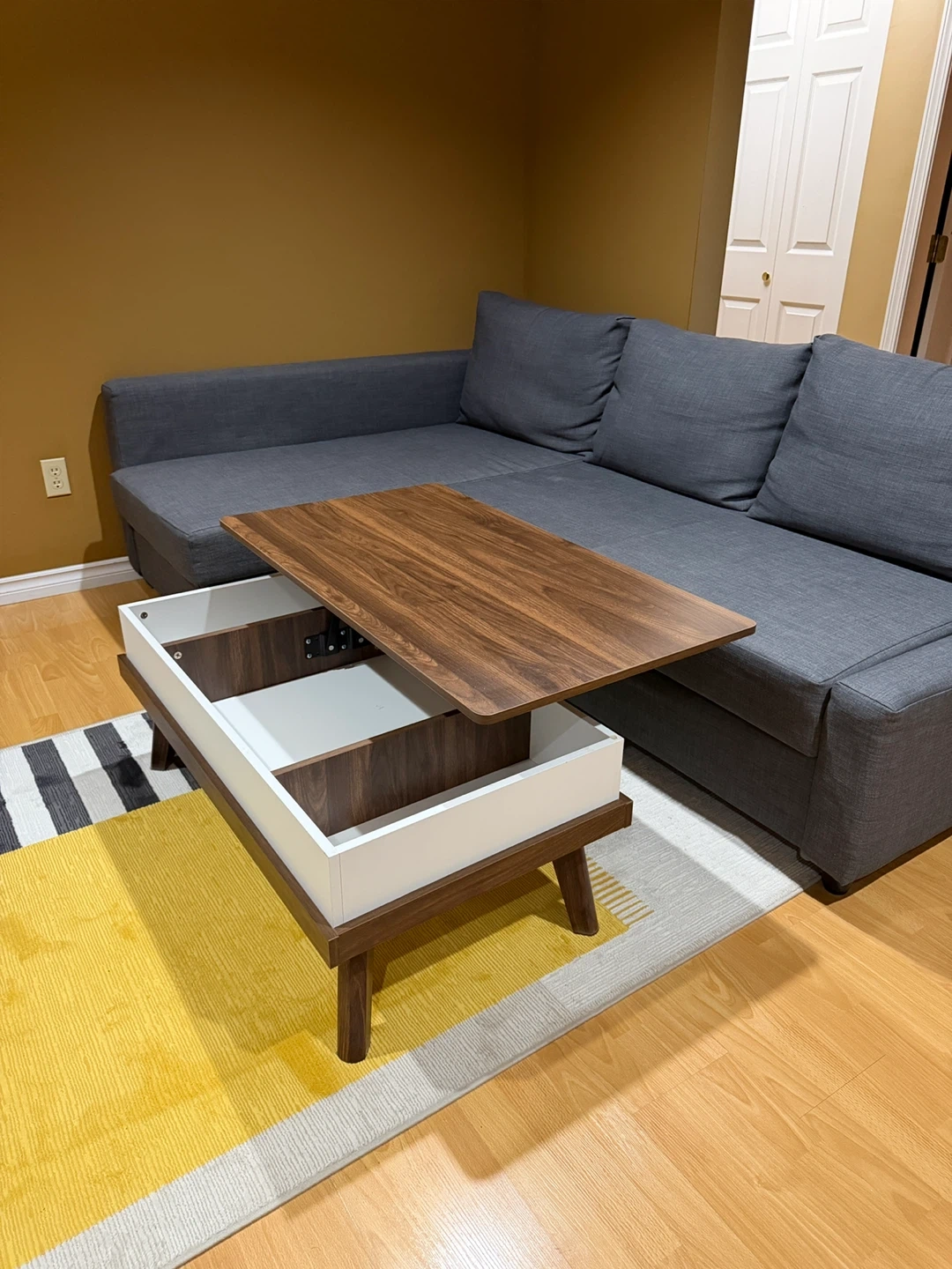 A modern lift-top coffee table featuring a walnut-look surface and ample hidden storage. Its design makes it handy for working or snacking from the couch. This table offers practical storage space for your living room needs. Stain Resistant, Scratch Resistant.