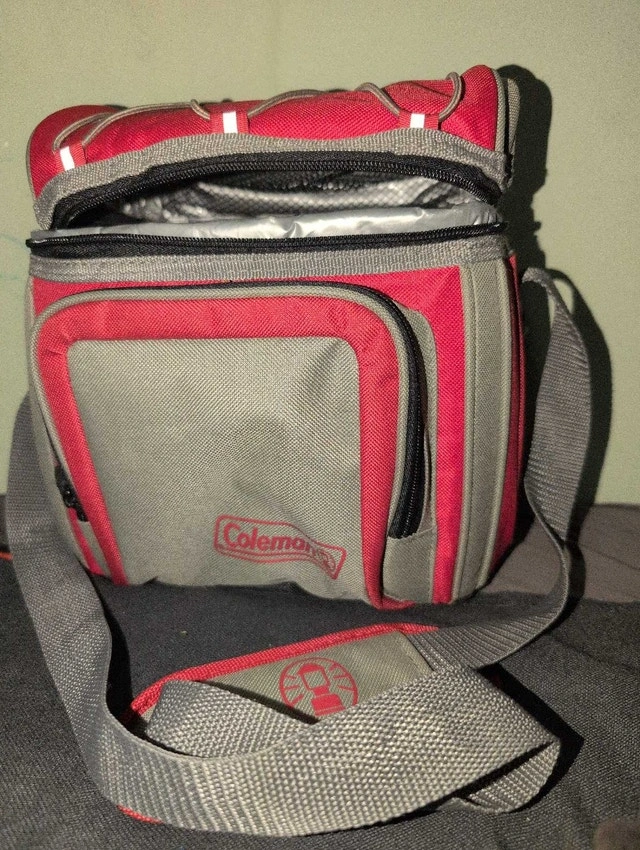 Keep your drinks and snacks cool with this Coleman cooler bag! It features a durable construction, insulated lining, and a convenient shoulder strap for easy carrying. It's in brand new condition, never used, and ready for your next adventure. Additional Features: Insulated Interior, Adjustable Shoulder Strap, Zippered Compartments. Cash accepted.