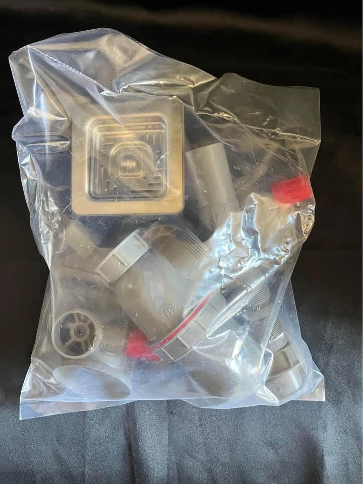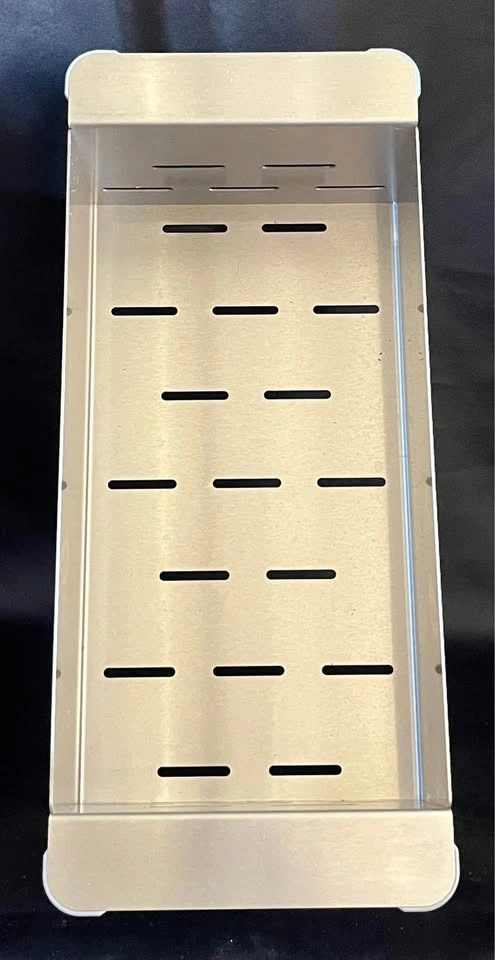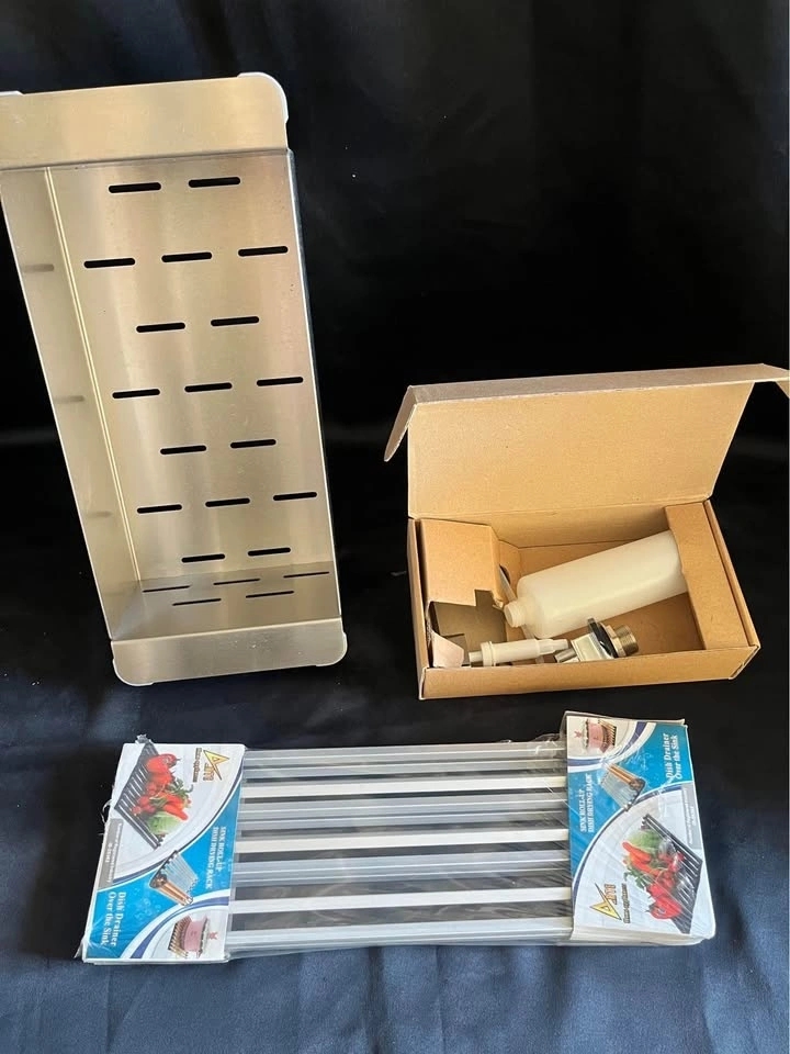 Pristine stainless steel kitchen sink with a single bowl and a hole for a faucet. Includes a roll-up dish drying rack, a slotted rack, drain assembly, and soap dispenser. Everything is still in original packaging or looks unused. Never installed.