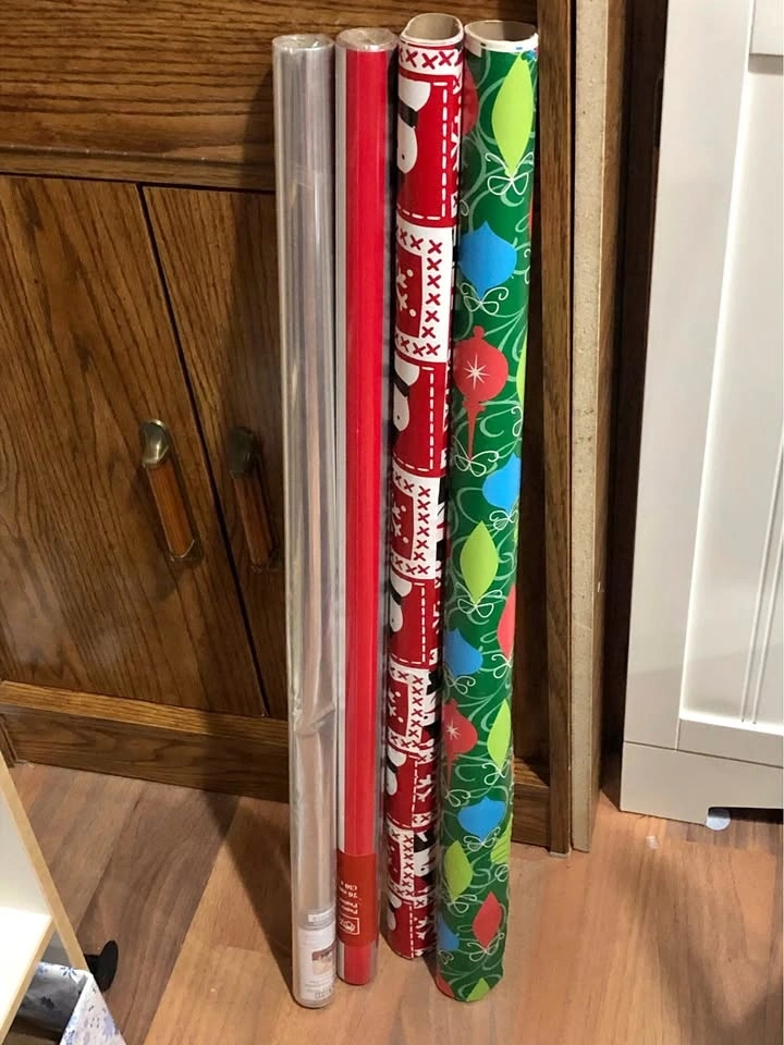 Includes one transparent plastic roll (great for gift baskets), one in shades of red, and two Christmas-themed rolls.