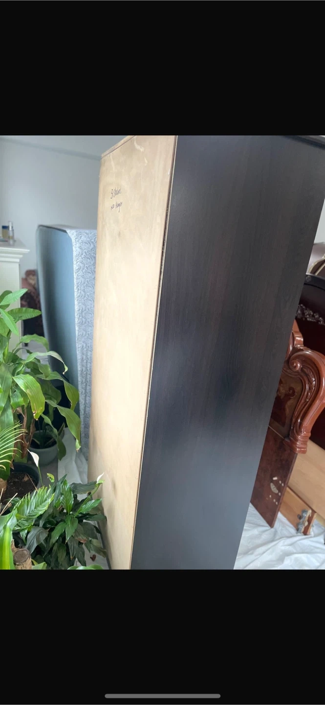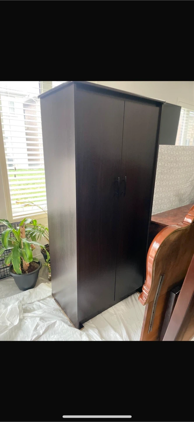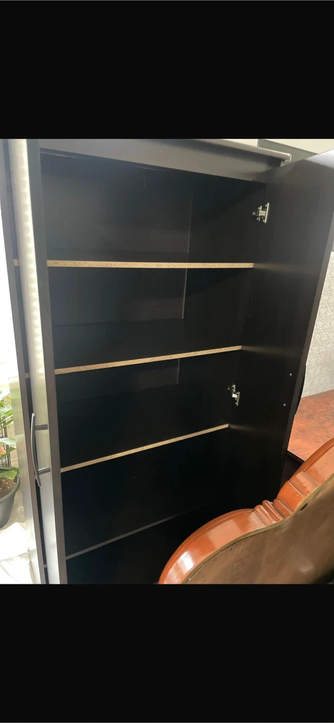 This is a dark brown two-door storage cabinet. It has three adjustable shelves inside for ample storage. Perfect for a closet or any room needing extra organization!