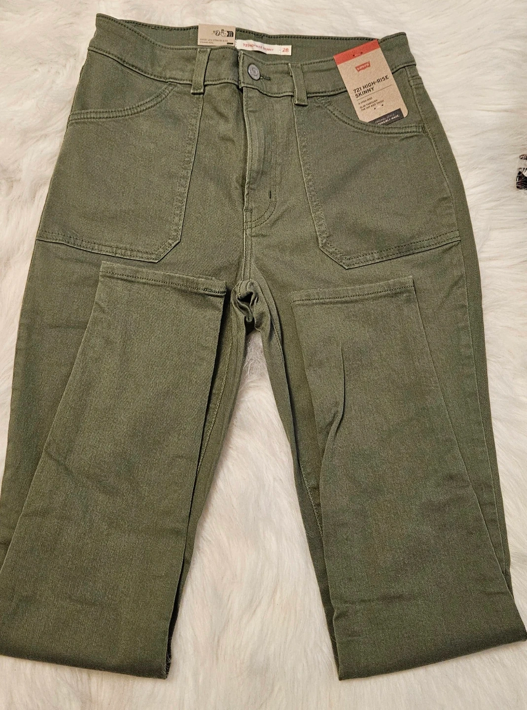 These are Levi's 721 high-rise skinny jeans in an olive green colour. They're a size 28x30 with a classic five-pocket design and zip fly. These jeans are made from a durable fabric blend.