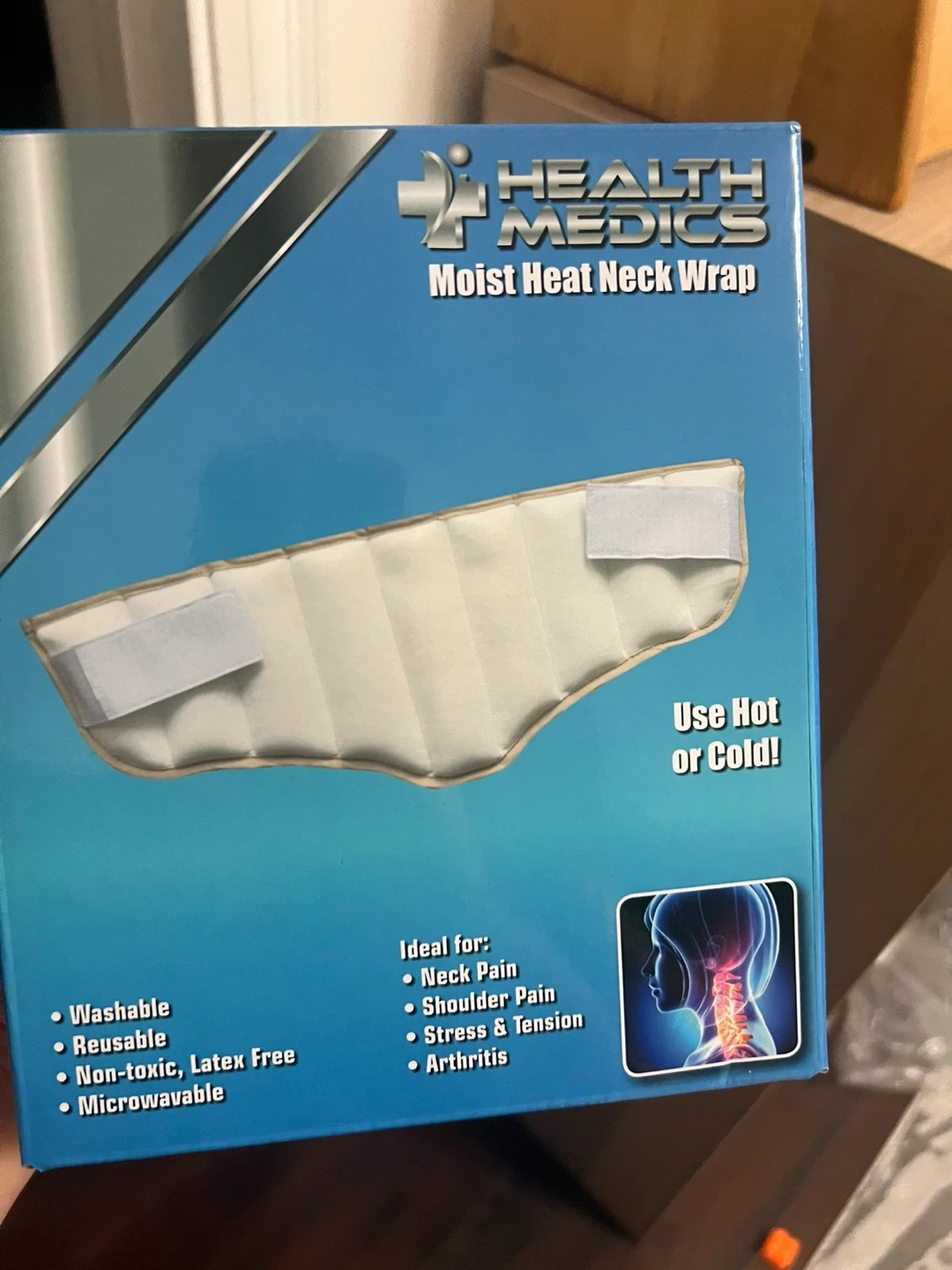 This Health Medics neck wrap is reusable and washable. It contains non-toxic, non-latex silica beads and includes one wrap and instructions. The wrap measures 52 cm x 19 cm (20.5 inches x 7.5 inches). It's ideal for neck pain, shoulder pain, stress, tension, and arthritis.