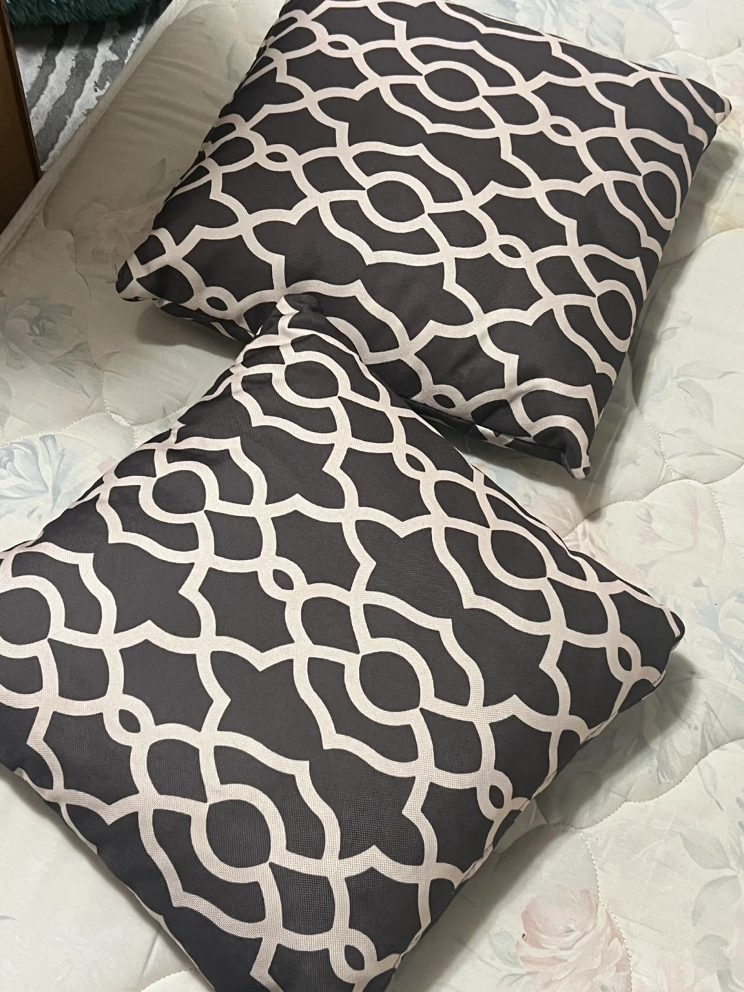 Two decorative throw pillows with a grey and white geometric pattern. Fabric appears to be a durable cotton blend. They're perfect for adding a touch of style to any couch or armchair!