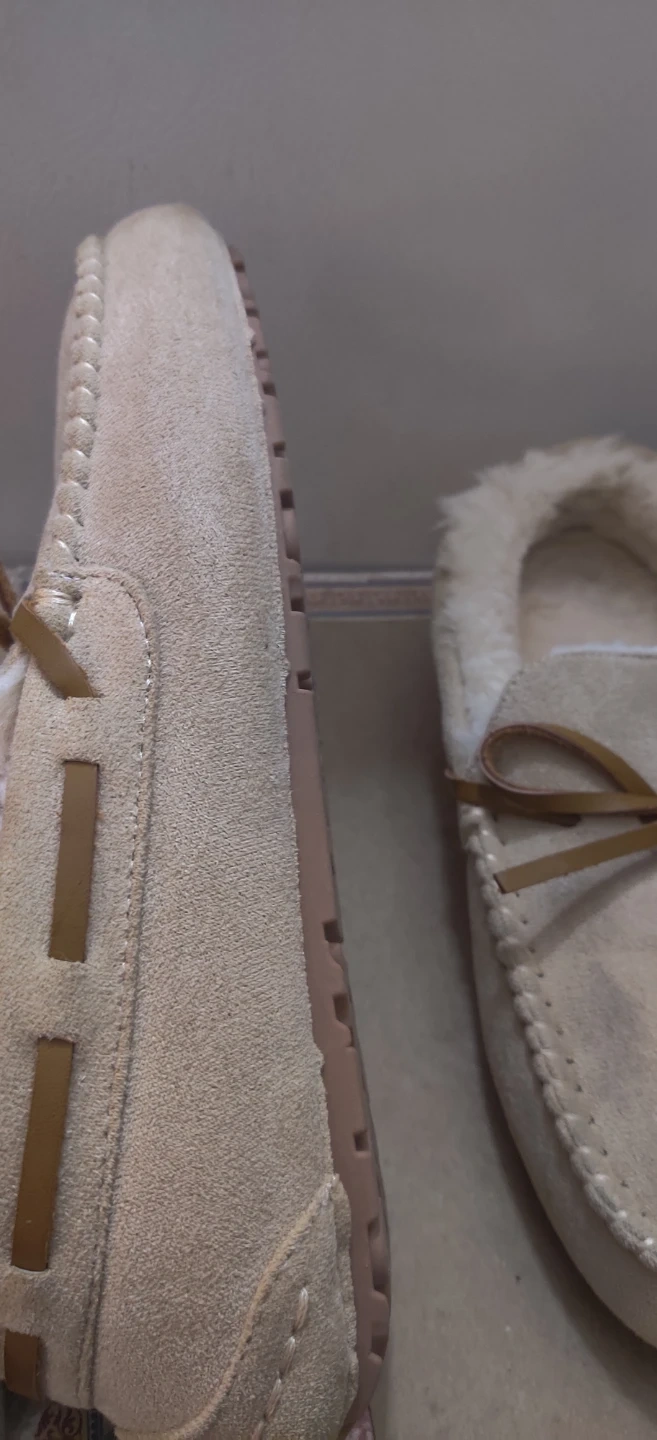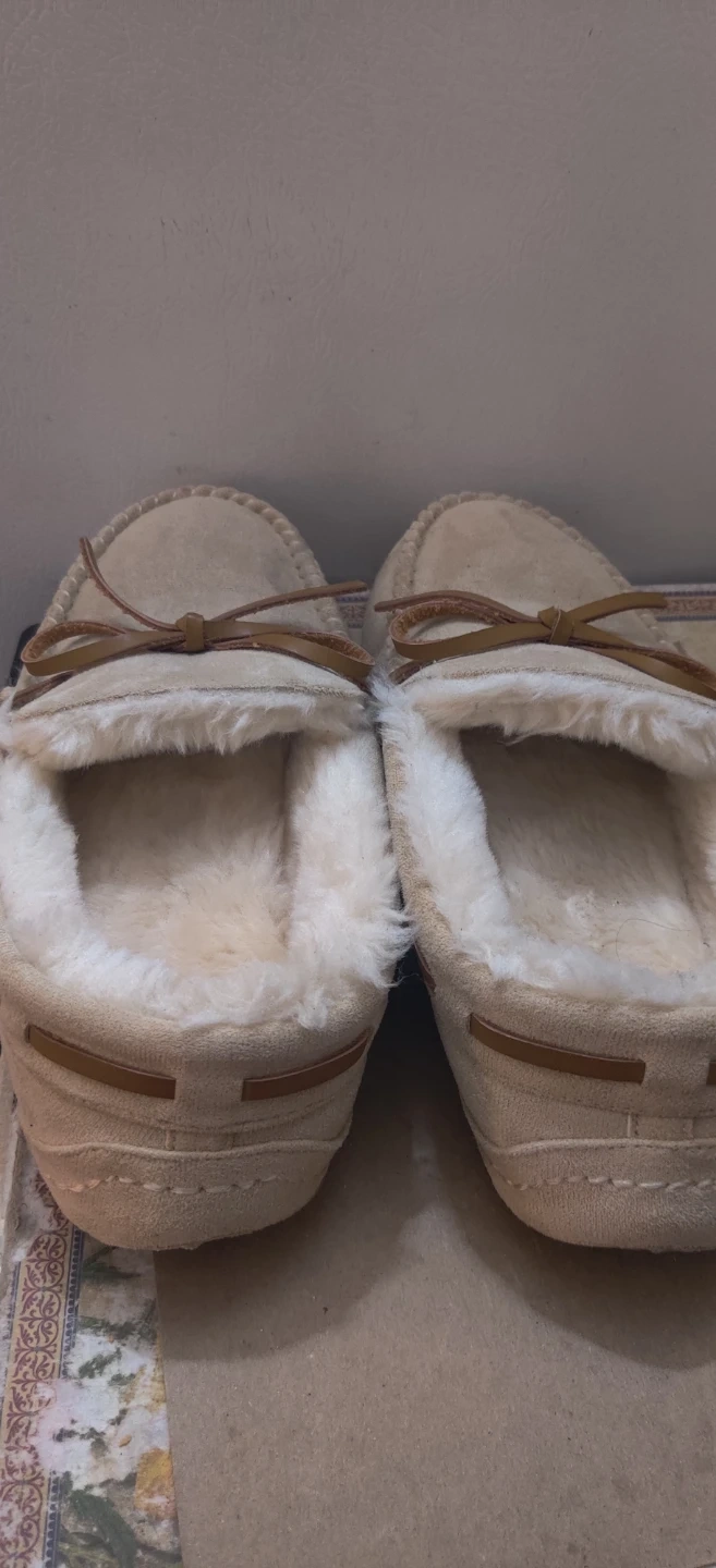 Comfy moccasin leather slippers in a tan suede-like material. They're lined with soft, warm faux fur for cozy feet. The durable rubber sole has a cloud pattern.mildley worn .