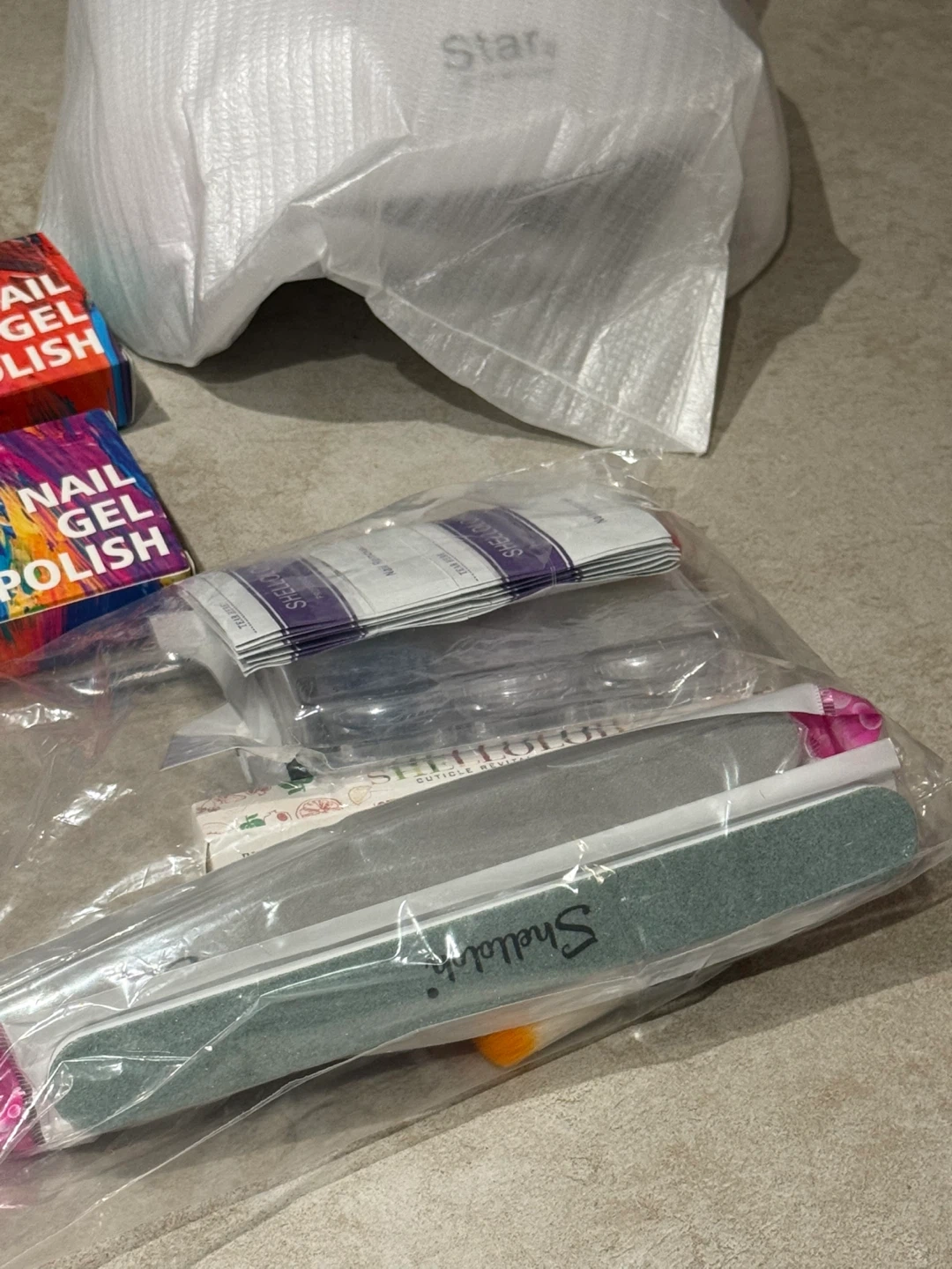 This new Shelloloh gel polish set includes a UV/LED lamp, several bottles of gel polish, nail files, and other accessories.