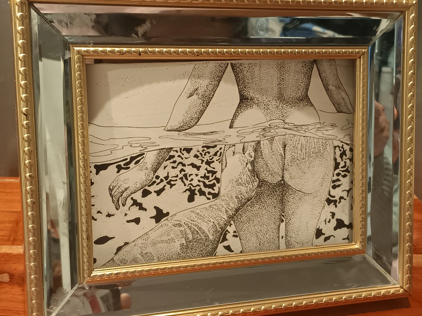 Framed ink drawing art print. Features a black and white illustration of a person partially submerged in water. The frame has a mirrored border with gold trim. It's a unique piece for any wall!
