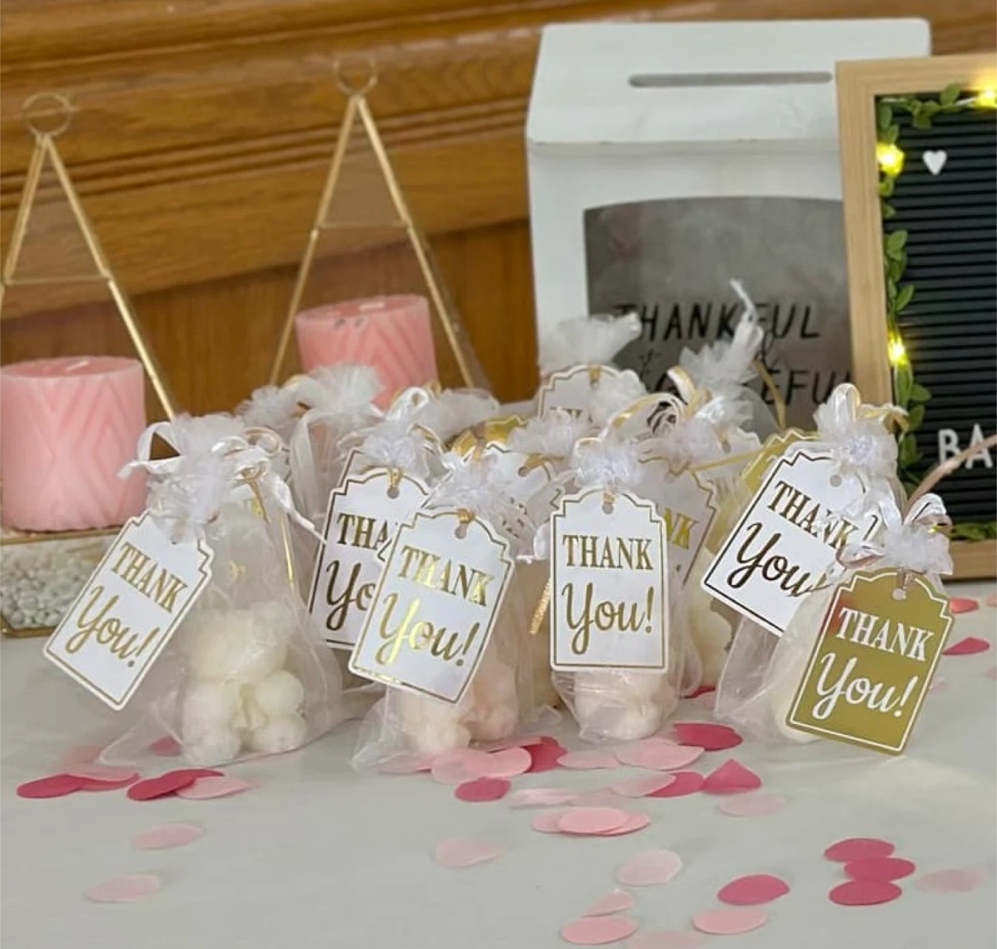 Cute bear candles, perfect for baby shower favors. Each candle is individually wrapped in a clear bag with a gold and white 'Thank You!' tag. Bear has a lovely rose texture. Some bears have a heart on the chest, others a bow. Great little gifts for guests.