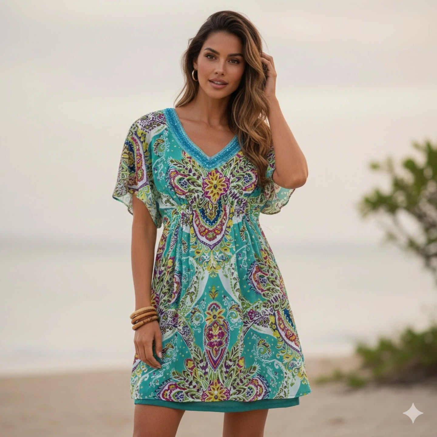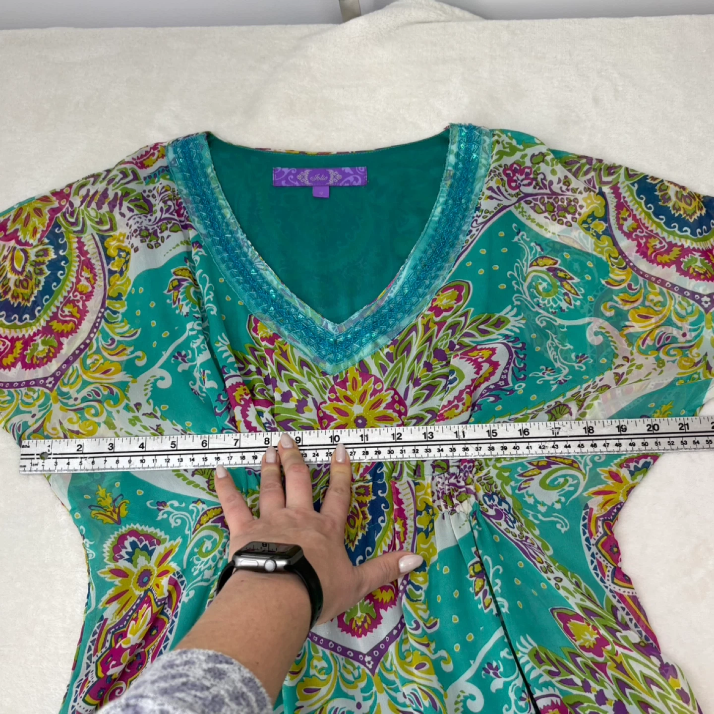 Embrace effortless bohemian style with this stunning Jolie flowy dress. This vibrant piece features an intricate paisley print in shades of turquoise, lime green, and magenta, perfectly complemented by delicate blue beading and sequins along the V-neckline. The flattering silhouette is gathered with an elastic empire waist under the bust to create a comfortable, feminine shape. Fully lined for coverage, this lightweight dress is perfect for summer festivals, vacations, or brunch.