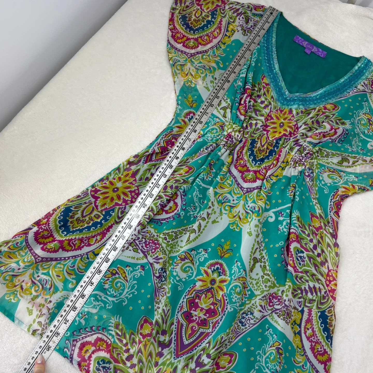 Jolie dress, boho style, paisley print, beaded neckline, flowy dress, empire waist, turquoise dress, summer fashion, festival wear, beaded dress, size 12, whimsical, feminine, colorful dress, lined mini dress.