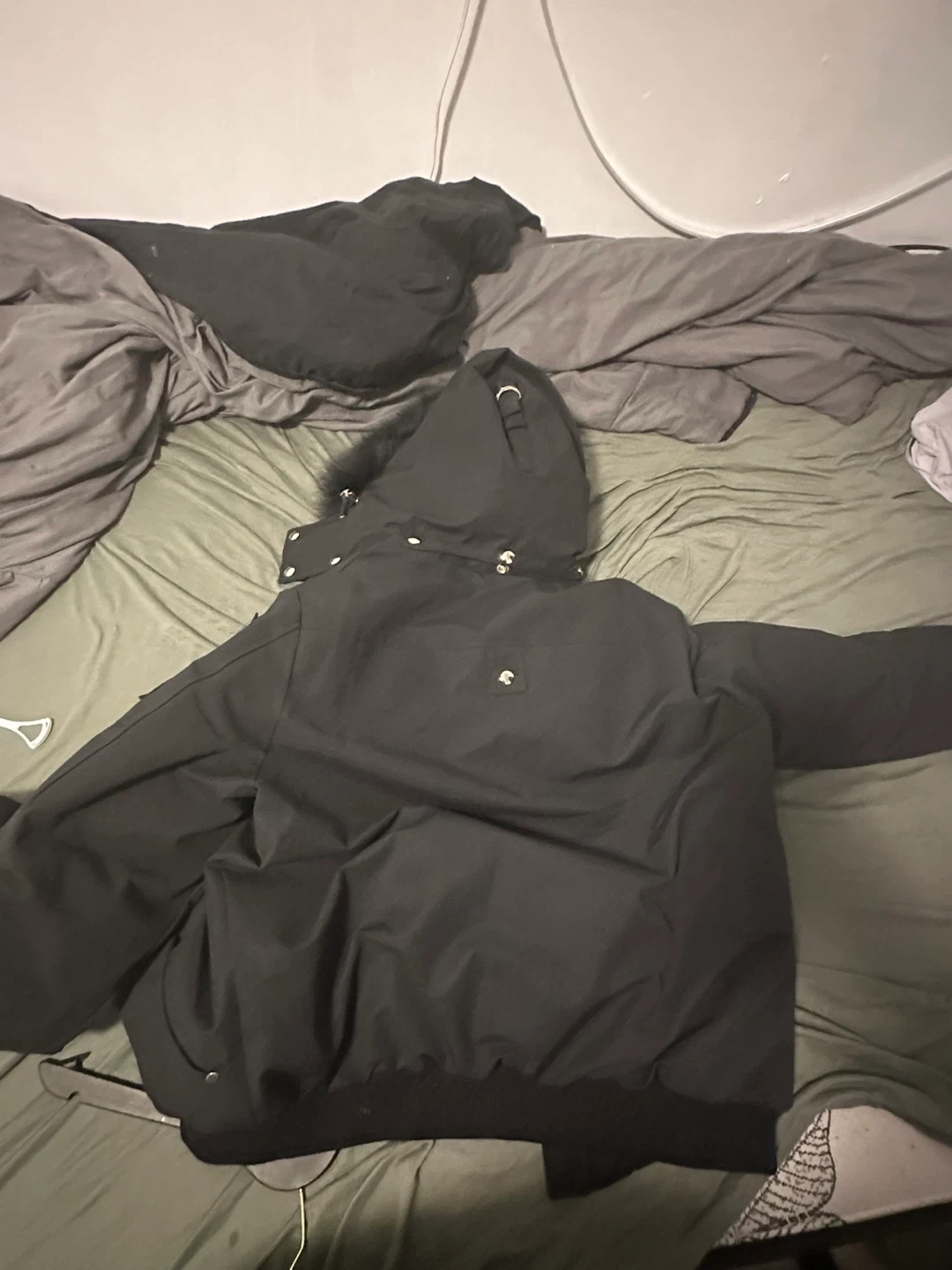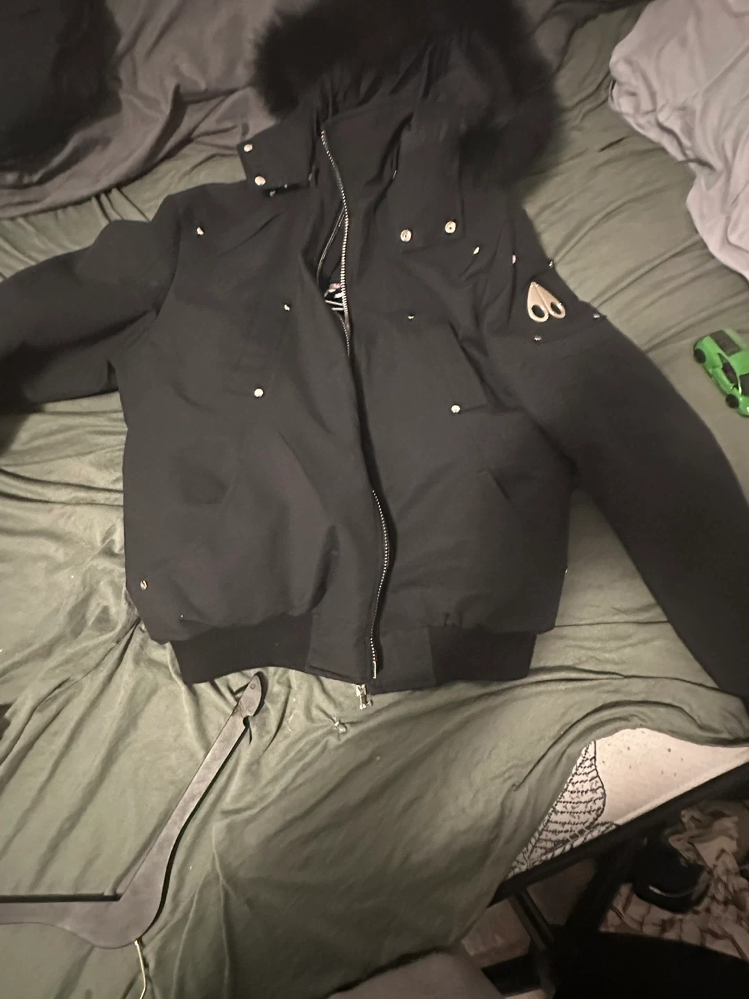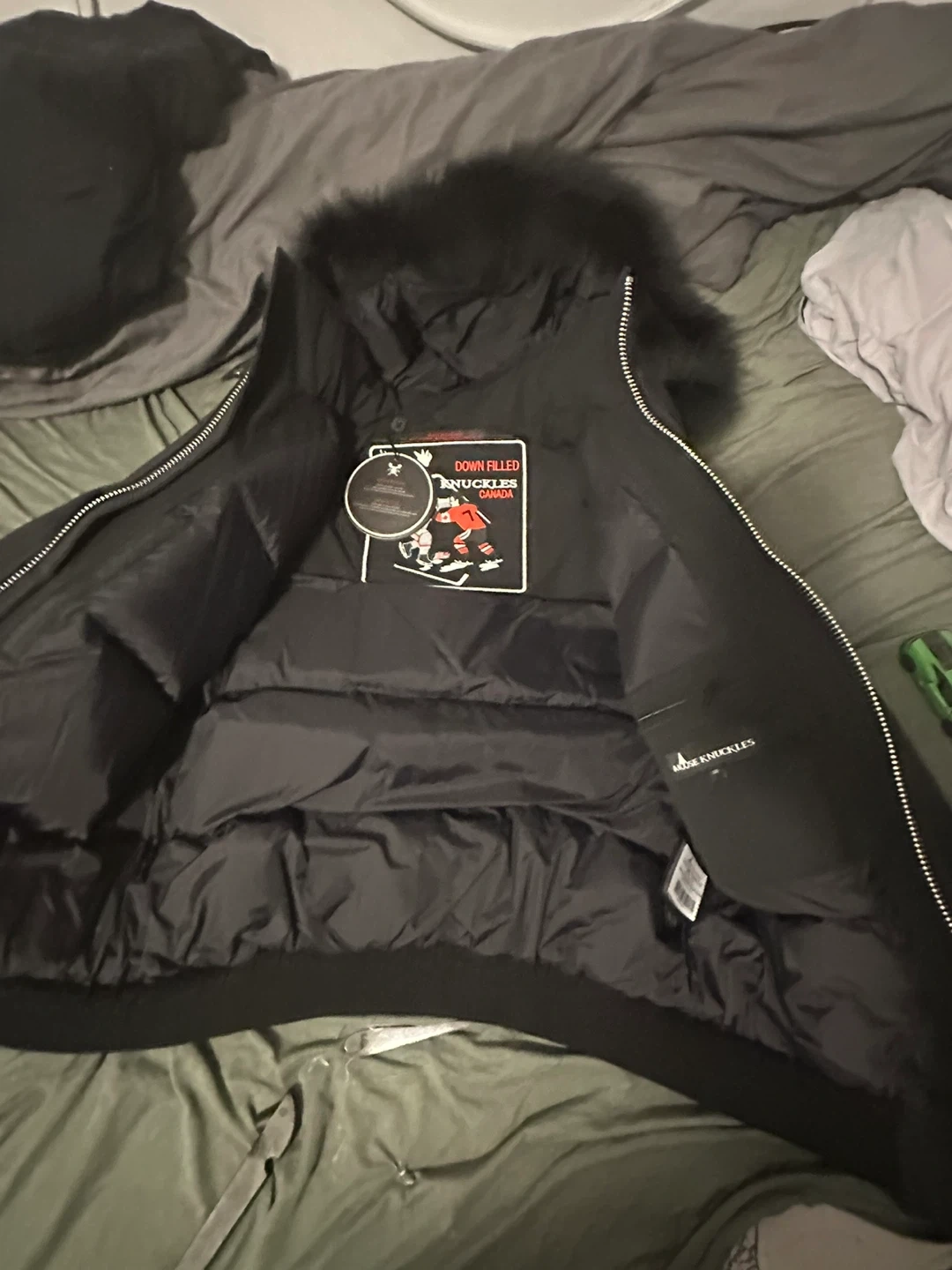 Black bomber jacket from Moose Knuckles. It's down filled for warmth. It has a fur-lined hood.