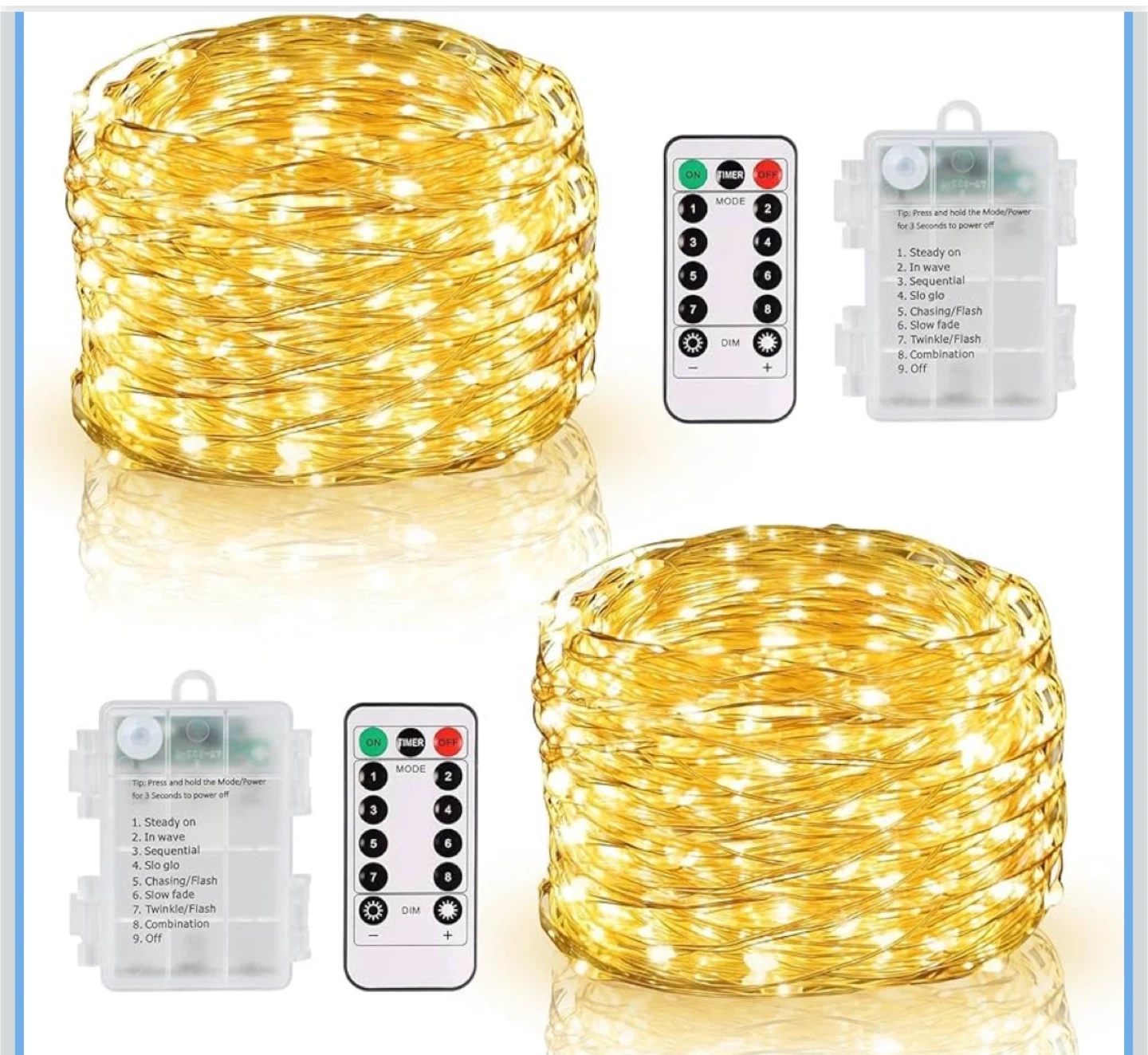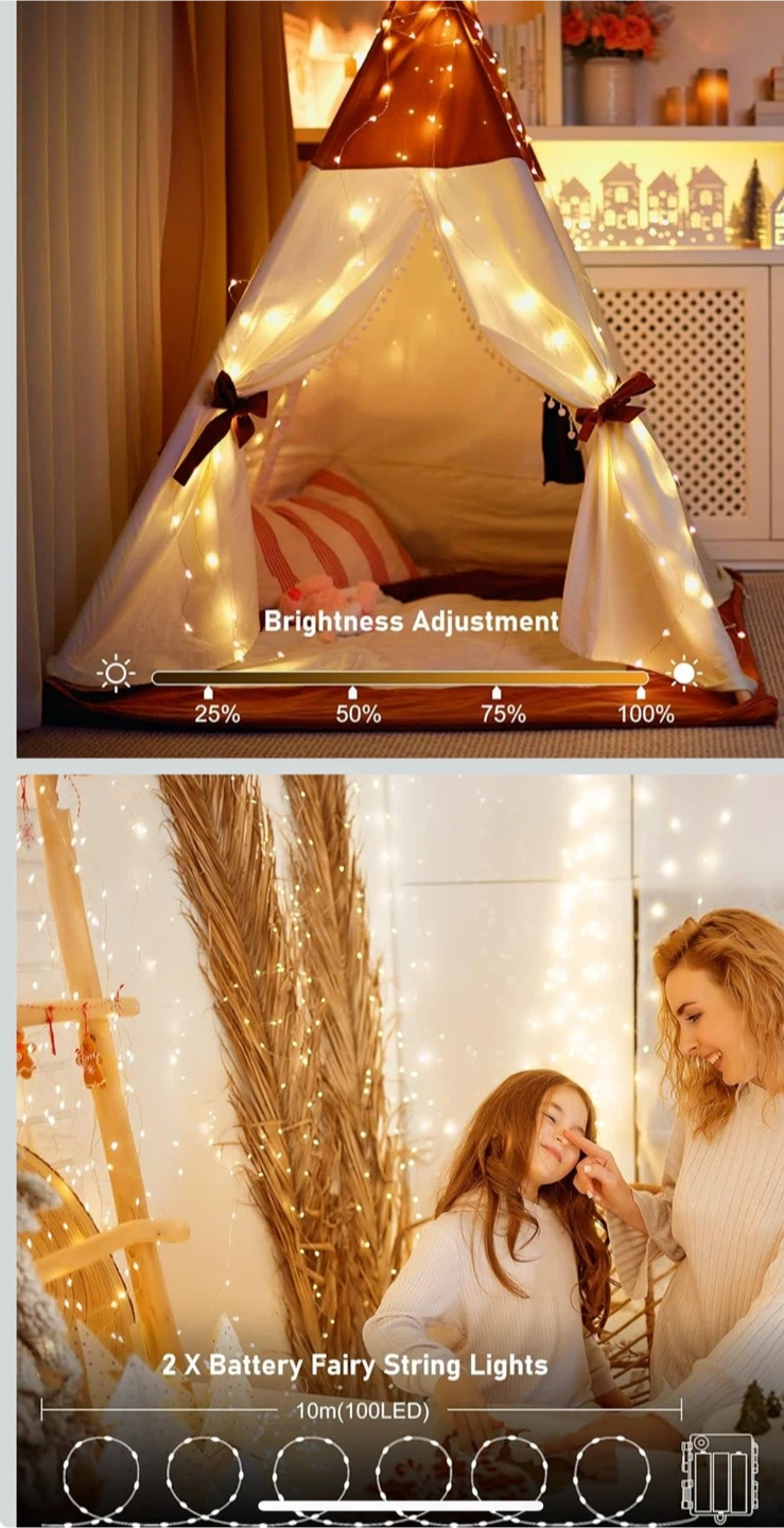 Includes two 10-meter strings of LED fairy lights, each with 100 LEDs. Both come with individual remote controls offering multiple modes and brightness settings. Battery boxes are included for power. Great for decorating tents, rooms, or outdoor spaces!