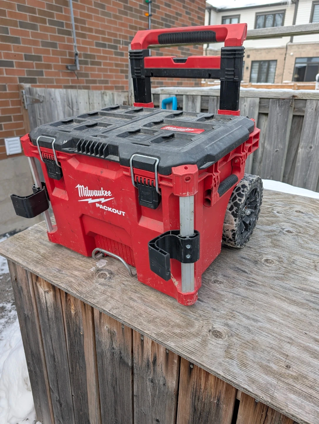 Milwaukee PACKOUT rolling tool box with telescopic handle. Heavy-duty construction for durability. Large wheels for easy transport on job sites. Perfect for storing and moving tools.